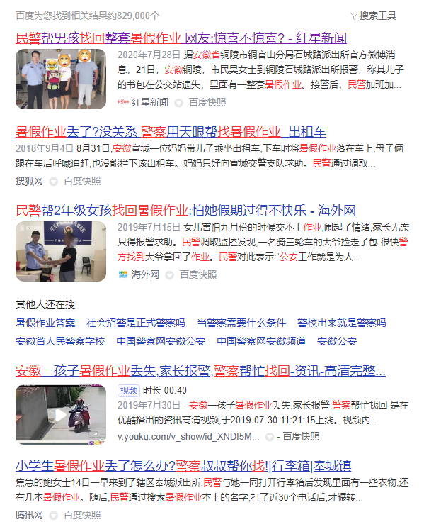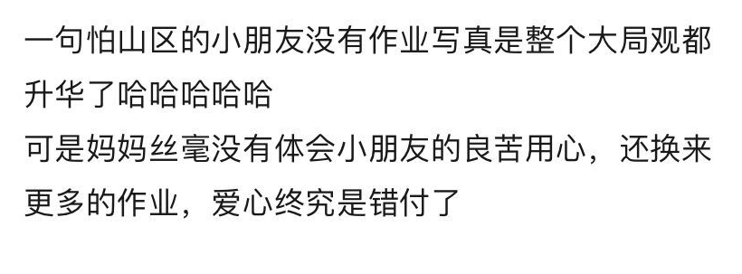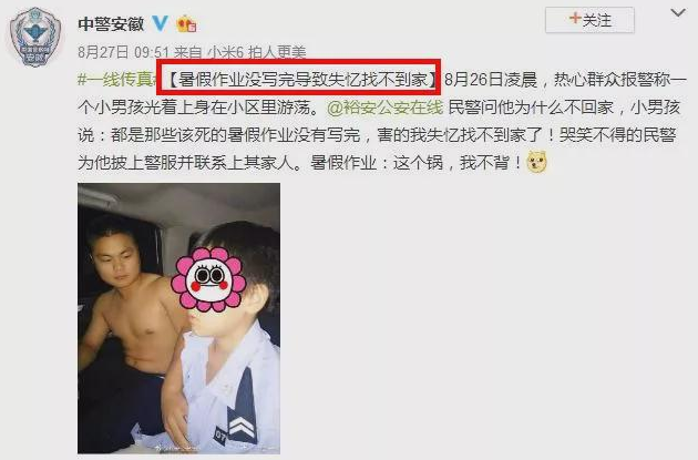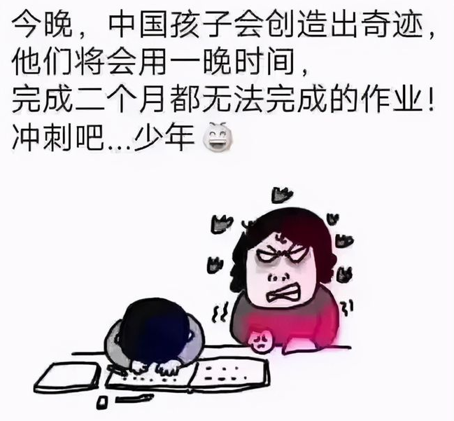 一、锣鼓喧天,鞭炮齐鸣 明天全国各地的宝宝们就要开学了 被熊孩子折腾两个月的父母们终于要解放了 接下来终于轮到老师们受苦了 宝宝们似乎还不知道用什么心情面对突如起来的开学 在宝宝们的眼里,放假其实就是这样的 眼睛一睁一闭,再一睁暑假居然用完了? 这时,天空中飘来一个声音 “您的假期余额已不足,请及时充值” 看起来宝宝们,还没有做好开学的准备,并在自己心里默念着~ 然鹅,一个念头突然在心中涌起,你的暑假作业写完了么? 回头看看自己书桌上的暑假作业,是这样婶儿的~ 开学前几天,全国各地学生家里一定是灯火通明,通宵达旦的,他们将用自己的行动创造奇迹,用两天的时间完成两个月的业绩。 全国各地的宝宝们心里一定是崩溃的,一定是痛苦的,一定也是悔恨的!为什么我不在两个月前就开始努力呢?你看看,我的黑眼圈又大了不少呢!! 也有在高铁上赶作业的 有在地铁上赶作业的 还有在路边的垃圾桶上赶作业的 还有启用物理外挂,左右开弓赶作业的! 这位更牛,物理开挂PLUS/PRO/MAX 此时,除了物理外挂,学生宝宝们恨不得三头六臂 但是只要思想不滑坡,办法总比困难多! 没有困难,制造困难也要上 于是全国各地的宝宝们,开启了脑洞ING~ 二、开学迷案之《消失的暑假作业》 “我怕山区小朋友没暑假作业写” 8月25日,杭州的一个快递点,发生了啼笑皆非的一幕。妈妈和女儿一起来捐书,却意外发现了女孩还没有写完的暑假作业。 网传视频中,快递员正在检查图书类型,并进行整理。女孩子好像有点不自然的看了看妈妈,发现妈妈貌似没什么反应,暗自松了一口气。 这时,快递员找出一本学生练习册,发现竟然是暑假作业!因为每个地区的教材版本不一样,所以练习册并不在捐赠范围内。 快递员小哥表示,这是暑假作业,寄不出去的!而且关键还“没写完呢!!!”为什么要捐呢?小女孩知道事情败露了,被问懵掉了,他紧张的摸了摸头发,不敢正眼看妈妈 听到这话,妈妈接过练习册一看,这不是孩子的暑假作业么?之前不是说暑假作业已经做完了么? 盯着“失而复得”的练习册,女孩紧握小手,满脸的委屈、无助!她半哭着告诉妈妈 “我只是想吧暑假作业分享给山区小朋友,怕他们家里苦难没有暑假作业可写啊” 妈妈表示,妈妈在家里整理捐赠的图书时,小女孩特别配合,并帮着妈妈一起打包!甚至想连暑假作业也分享给山区的困难小朋友,小女孩真的是充满了爱心呀!!!! 视频一出,就上了热搜 目前小女孩在妈妈的“关心”之下,已经开始恶补暑假作业了 2、警察蜀黍帮我找作业 近日安徽有一位家长,骑着电动车带自己的孩子走亲戚,但是在途中不小心小女孩把所有的暑假作业都给弄丢了,本来家长也没有注意到这个事情,回家了! 第二天准备监督孩子继续写作业的时候,发现暑假作业已经找不到了,临近开学,只能求助老师看有没有多余的,但是很无奈,老师那里也没有! 在跑遍了本地学生书店之后,也找不到相同的版本!最后实在没办法,只能求助警察蜀黍,于是报了警!民警在询问了当时的情况之后,查看了附近一路的监控录像 在民警的帮助之下,终于找到了丢失的书包!原来被骑三轮车的大爷捡去了,好不容易才找到了全套的暑假作业,该家长对民警同志的帮助表示了非常的感谢,孩子终于留下了激动的泪水!!泪水~~ 这其实不是民警第一次帮孩子找暑假作业,去年浙江金华警方也处理过一次类似的暑假作业“丢失迷案” 2020年7月24日,浙江金华城东派出所接到盛奶奶报警,称正在读小学的孙子孙女的暑假作业找不到了。接警后,民警蓝崇博立即赶往现场了解情况 原来当天上午盛奶奶正在搬家,将一部分行李暂放在楼道口,谁知再次下楼时发现两个孩子的书包和一个吸尘器不见了,吸尘器和书包都不值钱,但是书包里的暑假作业都在里面啊! 民警调查发现,当时有一位回收废品的人在楼道口停留了许久,并且做了一番挑选,只拿走书包和吸尘器这类可挥手转卖的物品走了!可能他把楼道门口这些东西当做别人不要的废品了。 经过警方的努力终于找到了这位收废品的人,并找回了孩子的暑假作业! 每到快开学的时候,网上随便一搜都是这样的画面 网上也有不少家长各种吐槽自己家里的熊孩子 警察蜀黍和各位家长们真的是为了暑假作业操碎了心那 各位宝宝们,明天就要开学了,你一定要快乐啊! 三、关于教育的一个好消息 7月底,教育部再次推出“双减”政策,主要是针对校外学科类培训机构,目的是进一步减轻学生学业负担。并且是在全国范围内大规模推行,力度前所未有,史上最大。 双减政策出台之后,经过一个月的市场反应,很多校外培训机构的股票应声下跌,并准备进行转型。今后,学科类的校外培训机构,将从义务教育阶段的中小学学科培训转型到音体美等领域的培训方向。 昨天网上看到了一则新闻,上海市教委负责人说“一部分人培训的时候,提高的是分数,所有的学生被迫去参加培训,提高的就是分数线” 这一切会变得没有意义,只能消耗更多的教育资源和社会资源!让家长背负沉重的经济负担,让孩子背负更多的学习成本,影响了学生的成长,并且牺牲掉了快乐和童年。 一个民族,最大的希望和责任就是教育好下一代 在一个万物内卷的时代,我们所做的一切都是防止“教育内卷化”。防止资本对教育的裹挟,防止全民对校外培训越来越“狂热”!总之就是让我们的孩子
