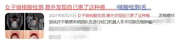 做个核酸检测,竟然发现自己患癌了? 近日,有这样一则新闻引起人们关注: 近几个月来,刘女士咽口水和吃饭时,总觉得喉咙有东西卡住似的。到社区做核酸检测时,意外发现自己舌根部下藏有一个巨大肿块。 之后经医生诊断,刘女士的舌根部肿物达到5厘米,活检病理诊断考虑为舌根腺样囊性癌。 舌根腺样囊性癌,可能很多人没有听过,其属于舌癌的一种。 那么,什么是舌癌?出现哪些症状要警惕?舌癌的高危人群有哪些?接下来,就给大家讲清楚。 什么是舌癌? 舌癌,是最常见的口腔癌,占全身恶性肿瘤的1.5%,占头颈部恶性肿瘤的5%。舌癌好发于40岁以上的人群,男女发病率为2:1。 舌癌可分为舌体癌(舌前2/3)与舌根癌(舌后1/3),舌体癌发病率高于舌根癌。舌体癌多数为鳞状上皮癌,舌根癌可为鳞癌、腺癌、淋巴上皮癌或未分化癌等。 按UICC临床肿瘤学手册分类,舌前2/3的属于口腔癌的范畴,舌后1/3属于口咽癌的范畴。舌癌常在早期向颈部淋巴结转移,晚期向肺等远处器官转移。 出现哪些症状要警惕? 舌癌多发生于舌缘,其次为舌尖、舌背及舌根等处。早期大多症状不明显,常被患者忽略或者误诊成其他疾病,但是舌癌生长迅速,进展较快,所以出现以下症状要高度警惕: 1、初期舌部出现小硬结,逐渐形成肿块或溃疡。 2、舌粘膜变为红白相间,不光滑,质地粗糙,由软变硬。 3、口腔溃疡一般1-2周愈合,超过90天不愈合的溃疡要高度警惕。 4、口腔内有明显自发痛或触痛,合并感染时产生剧烈疼痛,向同侧面部和耳部放射。 5、舌运动受限、进食困难、语言含糊不清。 6、口腔出血、张闭口困难、牙齿松动、唾液分泌增多。 7、有舌粘膜白斑、红斑病史,近期出现扩大、突起、溃烂。 8、颈淋巴结肿大。 舌癌的高危人群有哪些? 1、有舌黏膜白斑、红斑等癌前病变者,特别是红斑有更大的癌变倾向。 2、有舌体炎症或口腔溃疡长期不愈者,有癌变倾向。 3、有口腔卫生不良者,有癌变倾向。 4、有一口坏牙者,如牙齿不齐、牙的残冠残根、锐利的牙齿或牙龈边缘、不良义齿特别是金属义齿长期刺激舌粘膜,容易导致癌变。 5、吸烟者,尤其吸雪茄或使用烟斗吸烟者,易患舌癌。 6、饮酒者,尤其长期饮烈性酒者,发生口腔癌的机会比正常人多15倍。 7、喜食过辣过烫食物者,频繁刺激和烫伤舌黏膜,容易癌变。 患了舌癌如何治疗? 以手术为主,放化疗为辅的综合治疗是该肿瘤治疗的最佳方案。 根据原发灶的大小、位置、范围,选择合适的切除方式以及选择性或治疗性颈淋巴结清扫术。因为舌是咀嚼和语言的重要器官,舌缺损1/2以上应行一期再造术。 舌癌的颈淋巴结转移率高,常有早期转移,临床上即使摸不到肿大的淋巴结,并不等于没有转移,所以一般主张同时作选择性颈淋巴结清扫术。 放化疗可作为手术前后的辅助治疗,术前放化疗有助于肿瘤缩小后行手术切除,术后放化疗有助于清除残留微小癌灶,预防复发和转移。新闻中刘女士得的这种舌根腺样囊性癌属于舌根癌,比较罕见,对放化疗不敏感,只能选择手术切除。 此外还有选择性动脉化疗栓塞术、放射性粒子植入术、基因疗法、生物疗法、光动力疗法等。 近几年由于采用根治性广泛切除加颈淋巴结清扫术,舌癌术后五年生存率有了一定的提高,但目前中晚期舌癌的五年生存率仅为30-40%,早期舌癌为50%-80%。 如何预防? 1、养成良好的饮食习惯,戒烟限酒,不食过热、过烫食物,忌食用烟熏、油炸、刺激性强的食物,忌咀嚼槟榔等。 2,注意口腔卫生,保持口腔清洁。早晚刷牙,每次进食后漱口,养成良好的口腔卫生习惯,预防龋齿,保持牙齿牙龈健康。 3,每年进行口腔检查,特别是高危人群要加强筛查,做到早发现、早治疗。 " j( K+ g( ?2 o) t2 K7 t