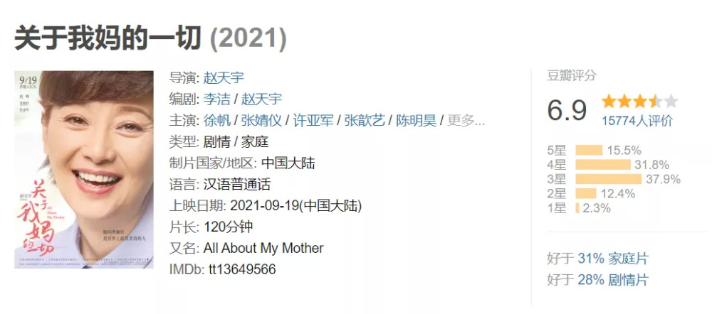 好电影有许多必需要素,好演员尤其重要,可以说是一部作品的灵魂。不过,如果一部电影遇到徐帆和张婧仪这样的好演员,口碑不增反降,那这个作品就一定有更严重的问题。 电影《关于我妈的一切》由徐帆和张婧仪主演,故事讲述了一对普通的母女,围绕亲情展开,是最近电影中难得的温情作品。 主题在千篇一律的动作片、末日片中脱颖而出,又有徐帆这个老戏骨演员和张婧仪这位新生代演员中的佼佼者撑台子,这部电影原本可以取得很好的成绩。但事实上,截至目前,已经上映近一周,电影的票房才刚刚破亿。 当然可能比起动作片,剧情片有劣势,但是不只是票房成绩差,这部电影的口碑也逐渐下滑,电影的豆瓣评分从最开始7.4分不断下降,滑到7.1分,然后继续下跌至7.0分,现在,电影的评分已经变成了6.9分。 虽然中秋档已经过去,但票房仍在增长,但也正因为有更多观众看过,所以电影的“真面目”却也显现出来,躲在温情主题下的漏洞被发现,口碑继续下滑。 这部电影最大的问题就是“狗血”,好好的母女主题被搞得一团糟。这几年,聚焦母女关系的电影也不少,尤其一部《你好李焕英》,无论是从票房还是从口碑上来说都是剧情片的标杆,因此,更多以此为主题的电影诞生。 但不是所有的相似主题的电影都能受到观众追捧,尤其是观众在欣赏电影中,总会无意识地将两部电影对比,这就更造成了一些电影缺点的暴露,《关于我妈的一切》就是如此。 说的是“关于我妈的一切”,实则不少片段都是围绕“我”这个女儿展开,电影中,张婧仪饰演的小美是一个普通的北漂青年,在一家经纪公司过着有头没尾的小助理工作,甚至狗血地与已经结婚生子的上司还有一段地下情。 即使张婧仪演技再出众,也不该这么作践啊,人设的不讨喜甚至背离道德标准,都很难让观众对这个角色产生兴趣。 得知母亲患有癌症前,她没心没肺,自甘堕落,刚得知病情,就立刻无缝切换成贴心的乖乖女,前后的情绪转换之生硬,实在让人难以入戏,这个人设的不合常理也确实糟蹋了张婧仪的好演技。 再说戏份被女儿瓜分一半后的母亲一角,由徐帆饰演,这个角色最大的毛病是不接地气。不知道编剧是如何设置这一角色,但从大荧幕上来看,完全不像一个山东妇女。可能与徐帆是一个南方人有关,剧中她的台词都嗲嗲的,虽然与她在剧中教师这一角色有关,但实在不符合一个北方妇女的样子。 我们熟知的徐帆还是电影《唐山大地震》中的模样,跪在废墟面前生死抉择,救儿子还是救闺女,演技令无数观众折服。 但是看过电影《关于我妈的一切》后,毫不夸张地说,徐帆似乎从神坛跌落了,电影中她的表现很难与《唐山大地震》中的她联系起来,演技不增反降。 同时,电影中她还有一个让许多观众不能接受的一点,这也与她的人设有关,就是“扶弟魔”这一形象。 弟弟因为吸毒被她告进监狱,她卖掉老房子替弟弟还债。弟弟出了监狱后她常常送钱送菜送饭,各种补贴,最后甚至把卖掉老房子后仅剩的一点也给了弟弟,这样的姐弟关系也难怪会引起网友声讨了。 总的来说,电影口碑的不断下跌,与主演演技有关,更与角色人设及故事内容有很大关系。 比起张婧仪和徐帆因为演技和人设遭到质疑,饰演父亲的许亚军的表现则获得了许多人的赞美,在海边对着快要去世的妻子的告白惹哭一众网友,许多观众表示,许亚军是这部剧的最令他们惊喜的演员。 ( _* v8 V0 v: E0 I8 w% i