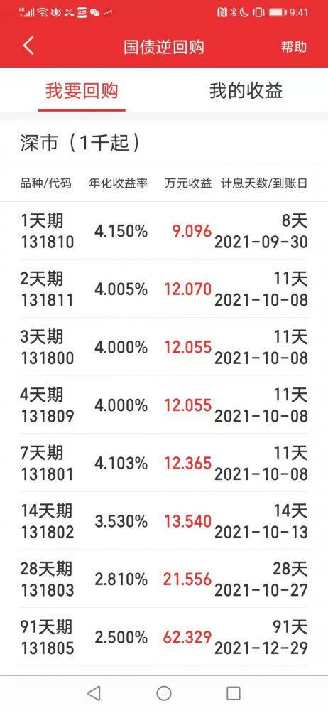 国庆长假即将来临,股市休市,躺在账户的闲置资金怎样“动起来”? 9月29日,记者结合国庆放假安排发现,今日闲钱理财迎来最佳时间点, 选好合适的操作路径,最多可“躺赚”8天利息。 国债逆回购相当于一笔短期借贷投资。投资者通过国债回购市场把自己暂时不用的资金借出去,从而获得固定的利息收益。另一方面,回购方也就是借款人,用自己的国债作为抵押获得这笔借款,到期后还本付息。 国债逆回购的资金门槛有要求,沪市10万元起,深市1000元起,均以整倍数递增。依据期限不同,国债逆回购有1天、2天、3天、4天、7天、14天、28天、91天和182天共计9个品种。 国债逆回购利率与市场资金面松紧关系很大,市场缺钱的时候,报价就高;市场资金宽松时,报价就低。 从购买时点来看,投资者一定要提前做好资金安排。若在9月29日,进行1天期逆回购,计息时间为8天(9月30日至10月8日),利率为4.150%,投入金额为10万元,那么可获得的利息为90.96元。 但是,等到9月30日再做逆回购,就拿不到假期利息“红包”。这是因为长假后第一个工作日,即10月8日才是资金首次交收日,也就是说,资金在账上“白躺”了整个长假。 此外,通常在下午3点后,逆回购利率多会出现跳水。虽然从不影响股票交易的情况下,可等待收盘后再参与逆回购操作,但如果当天并无好的股票投资机会,投资者可考虑在下午两点前就锁定满意的年化利率完成下单。