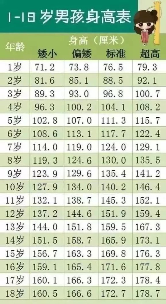 日前出台了1-18岁儿童身高的对照表,大家可以看看自己家孩子的身高是否符合标准。 看过对照表之后,各位家长对自己孩子的身高是否符合标准有了准确的判断,其实入秋后,孩子长高又进入“冲刺阶段”。根据世界卫生组织发布人体生长速度的报告中显示:一年当中五月是人体生长最快的月份,其次就是6-10月。因此,如果孩子身高偏低,家长一定要抓住时机,帮助孩子快速长高。 看到这家长会问,究竟如何快速帮助孩子长高。大壮先不说如何长高,先说说为什么长不高,首先就是遗传因素,家长身高在一定程度上觉得了孩子的身高,但是后天还有一些因素的影响。其中主要有三点因素,首先是营养问题,营养不良起了很大作用,其次是运动因素,运动不足,尤其是户外活动因素,还有就是睡眠,睡眠不足也产生不小的影响。那知道了是什么原因导致的身高发育不足,也就好对症下药了。 1、想要长高,还要多参加户外运动。 想要长身高一定要多参加体育活动,尤其是多参加户外运动,晒太阳可以补充维生素D,可以使自己骨骼健壮,从而也会增高。纵向运动可以帮助快速提升升高,引体向上、篮球、排球、跳跃、跳绳、踢毽子和游泳都是非常好的运动类型,每天至少有20—40分钟的有效运动时间为宜。 2、保持充足的睡眠 根据调查,一个是晚9点至第二天凌晨1点,特别是晚上10点前后,人体的生长激素的分泌量达到最高,可以达到白天的5-7倍。另外,早上6点前后的一两个小时,生长激素也有一个分泌小高峰。所以大壮哥建议:要孩子长得高,最好在晚上8:30前就上床,最迟不要超过晚9:30,并在早上7点以后再起床,保证每天十个小时的睡眠时间。 3、膳食均衡 坚持每天早晨吃饭的时候喝一杯牛奶,吃一个鸡蛋,用来补充营养。中午吃一个苹果,来补充维生素。 鸡蛋是最容易购买到的高蛋白食物,而且营养价值很高,家长也不用过于担心蛋黄中含有的胆固醇对孩子不好,对处于成长期的孩子来说每天吃1~2 个鸡蛋是比较合适的。 菠菜中含有大量的β胡萝卜素和铁,也是维生素B6、叶酸、铁和钾的极佳来源。菠菜能为孩子提供铁和钙,使孩子长高。 豆类是目前蛋白质含量最高、质量最好的食物,供给人体的生长发育,尤其是豆类中的大豆,大豆除甲硫氨酸较少外,其余均较丰富,特别是赖氨酸含量较高。所以家长可以每天给孩子做各种豆制品,来补充营养。 最后大壮哥想说,现在好多孩子都是在父母家长的呵护下长大,一遇到困难和挫折就会退缩,产生心理压力,就会产生焦虑情绪。家长要让孩子学会减轻压力,让孩子学会放松。因为情绪的变化也会影响荷尔蒙的正常分泌,影响孩子身高的发展。 9 Z- W# O$ ]8 N3 X5 q+ f/ C7 g1 [ C