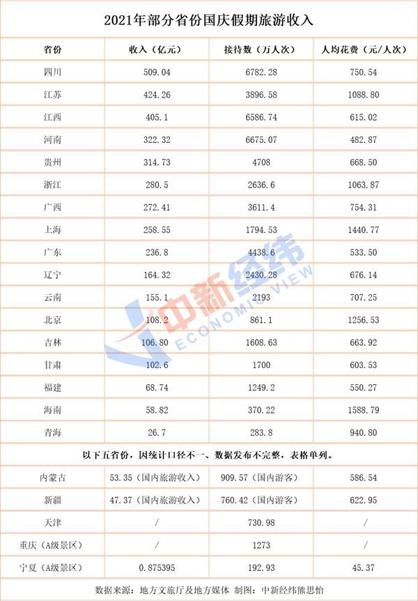 2021年国庆假期刚落下帷幕,22省份已先后交出旅游成绩单,你的家乡表现如何?来一睹为快! 四川7天入账509亿 经文化和旅游部数据中心测算,10月1日至7日,全国国内旅游出游5.15亿人次,按可比口径同比减少1.5%,按可比口径恢复至疫前同期的70.1%。实现国内旅游收入3890.61亿元,同比减少4.7%,恢复至疫前同期的59.9%。 据不完全统计,截至10月10日,22省份公布国庆假期文旅数据。其中,四川省一马当先,黄金周期间接待游客6782.28万人次,实现旅游综合收入509.04亿元,按可比口径比较,分别恢复到2019年同期的99.95%和95.97%,较2020年同期分别增长29.85%和21.41%。 四川省文旅厅介绍,“三九大”(指九寨沟景区、三星堆博物馆、成都大熊猫繁育基地)等重点景区持续火爆,引领文旅市场强劲恢复。值得一提的是,9月28日,九寨沟景区全域恢复开放,国庆期间连续3天提前售罄门票,共接待游客16.52万人次,门票收入达2243.84万元。 此外,江苏、江西国庆旅游收入均超400亿元;河南、贵州紧随其后,位于“300亿元梯队”;浙江、广西、上海、广东排序稍后,位于“200亿元梯队”;另有辽宁、云南、北京、吉林、甘肃5省份国庆旅游收入超100亿元。 川豫赣游客均超6500万 按游客接待量,四川、河南、江西国庆期间均接待游客超6500万人次,合计约2.00亿人次,占国内旅游出游总人次的比例达38.83%! 河南日报报道称,假期前3天,天气晴好,客流激增;后期受阴雨天气影响,市场行情有所回落。整体数据显示,全省旅游市场突破种种不利因素,呈现出良好的消费势头。 河南日报还提到,假日期间,国潮国风成为新亮点,传统文化备受青睐。清明上河园景区的“十一奇妙游·演艺狂欢节”,融合戏曲、杂技、武术等传统文化元素,每天举办各类演出170余场,让国潮成为热潮。 江西旅游市场复苏势头同样强劲,据江西省文旅厅,10月1日至7日,江西省累计接待游客6586.74万人次,实现旅游收入405.10亿元,甚至比2019年(疫前)同期分别增长5.19%和4.40%。 贵州、广东、江苏、广西也是“游人如织”,游客接待量均在3000万人次以上;浙江、辽宁、云南、上海、甘肃、吉林、福建7省份游客接待量均超千万。 “河南游”花费低,人均不足500元 资料图。中新经纬摄 根据22省份旅游收入、游客接待量粗略估算,“河南游”人均花费最低,人均482.87元/人次;“海南游”人均花费最高达1588.79元/人次。 “海南游”花费较高或与火爆的离岛免税市场有关,海口海关数据显示,10月1日至7日,海口海关共监管离岛免税购物金额14.7亿元,购物件数200万件,购物人数18万人次,同比分别增长66.9%、136%和61.6%。 记者注意到,多数省份人均花费集中在500-800元/人次区间内,上海、北京、江苏、浙江等人均花费则在千元以上,分别为1440.77元/人次、1256.53元/人次、1088.80元/人次、1063.87元/人次。 中国旅游研究院9日发布报告指出,国庆假日期间,城市居民出游热情和消费意愿高开缓走,出游人次领跑旅游收入。家国情怀拉升红色旅游热情,游客在行程中广泛参与文化活动,领略传统文化之美,增强当代文化自信。都市休闲游、省内近程游、郊区乡村游、自驾游、亲子和研学游成为假日旅游市场新亮点。 4 c$ r8 g* @8 M6 b, ?1 N# l