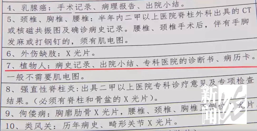 一年多前,市民王先生因患脑部疾病不幸成了植物人,没有任何行为能力,然而,家属申请伤残鉴定证明时,却被要求王先生本人必须亲自到场,这也太……强人所难了吧。 王先生的妻子张阿姨告诉记者,丈夫一年多前患有脑部疾病,虽说做了手术,但身体还是每况愈下,逐渐变成了植物人,目前住在杨浦区新华医院。 张阿姨和家人一直在医院悉心照顾王先生,但是高额的治疗费用压得他们喘不过气来,张阿姨为此感到身心俱疲,却一直没有舍得放弃老伴。 求助人张阿姨: 现在费用很厉害很厉害的!当时说10万就行,已经30多万用掉了,而且我服侍他一年,自己全身也都是各种病痛。 在了解到植物人一旦办理残疾证,就会得到部分费用补助后,张阿姨的弟弟来到杨浦区长白新村街道社区事务受理服务中心,打听如何为王先生办理残疾证。 根据街道提供的病史材料清单显示,植物人属于肢体残疾类别,王先生符合申请条件。 而想要办理残疾证,首先需要前往街道社区事务受理服务中心递交申请材料,获得一张残疾评定预约单,这个步骤可由他人代办。 长白新村街道社区事务受理服务中心工作人员毛旭岚: 如果是植物人的话,首先会让他提供一些之前的病史,来确定他到底可以办哪个等级的残疾证,然后会交给家属一份申请的菜单,包括所需的相关材料,申请流程是要家属带好他所有的申请材料来窗口办理,申请好了之后,会给他一张预约单。 工作人员表示,经过上述步骤后,接下来的评定就需要由本人参与了。预约单上显示,伤残等级鉴定这个步骤,需要申请人本人携带身份证等材料前往指定医院。 长白新村街道社区事务受理服务中心工作人员毛旭岚: 给居民的预约单上写明,申请人要携带本人身份证及残疾评定所有的材料,再带好预约单到相关医院做鉴定。 这一要求让张阿姨"哭笑不得",丈夫都已经处于植物人状态了,还怎么"亲自"到场呢? 那么,可以直接在王先生目前住院的新华医院做残疾鉴定,省去路途奔波吗? 记者查询后发现,在杨浦区,做肢体残疾类伤残鉴定的医院只有杨浦区中心医院和一家康复医院,王先生所在的新华医院并不在其中。 张阿姨联系了杨浦区中心医院和相关部门,询问是否必须已是植物人状态的王先生本人亲自前往做鉴定,也得到了肯定的答复。 求助人张阿姨: 一定要本人去,不是本人不能做鉴定。电话里我求他们,我说我老公真的不能走,对方表示“那没办法,一定要本人来”。 随后,记者致电杨浦区残联,工作人员也表示确实要植物人本人前往指定医院。 杨浦区残联工作人员:评残一定要到医院去的呀,没有上门评残的。 记者:过往病史拿过去,也不行的,是吧? 杨浦区残联工作人员:对!医生一定要看到病人的, 全市都是这样。 记者:杨浦区是不是只有两个医院可以做评残鉴定? 杨浦区残联工作人员:对的。 无奈之下,张阿姨想过叫120救护车或者出租车接送王先生往返。但因费用、时间等种种原因,未能成行。 张阿姨弟弟: 本来是叫救护车的,后来觉得救护车费用太高了,因为本来自药费用就很高的,承受不起。 最后,还是请朋友帮忙,开车送王先生和张阿姨去了杨浦区中心医院。但把已是植物人的王先生搬上车,也不是一件容易的事。 求助人张阿姨: 我们是请我老公的同事帮忙,他正好有车,就把我们带过去;然后再请他和护工一起把老公抱上去,前后两个小时不到,真的太累了。 对此,街道工作人员表示,街道的工作只负责到给予申请人预约单。之后的伤残鉴定,残疾证的领取等步骤均与街道无关。植物人王先生的遭遇他们会向相关部门进行反映。 长白新村街道社区事务受理服务中心工作人员毛旭岚: 市级平台到时候会将信息发送到申请人的手机号上,他相关的材料都不会在社区事务受理中心,证也不是我们这里发的。我们会将这个案例向上级部门沟通。 张阿姨弟弟: 太费劲了!也是太折腾病人了!抱上抱下的,我们吃力无所谓,还折磨病人,要跑来跑去、抱上抱下; 过去(杨浦区中心医院)一看,他们根本就不检查的,就直接写病历的,有意思吗?你上门一看就知道的,就只是看了一看就写结果了。 到这里,王先生的伤残鉴定申请算是按照规定流程走好了,他终于亲自到场证明自己是植物人。