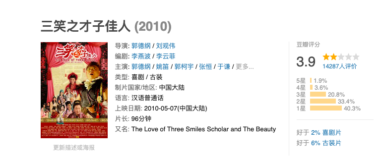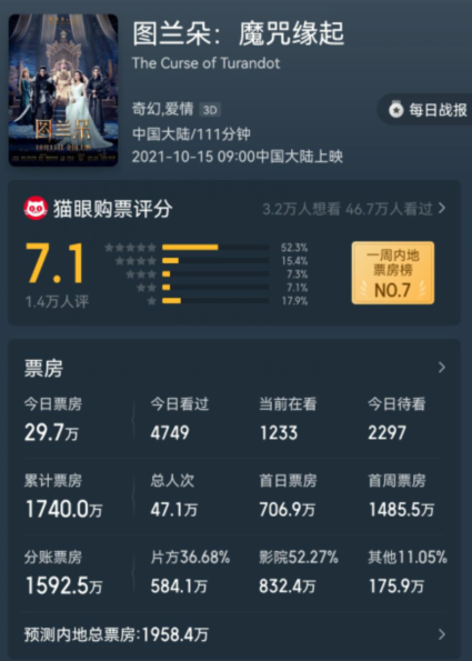 很多人没想到,国庆档后第一部大投资国产电影《图兰朵》的票房竟然会如此惨淡! 要知道这部电影可是拍出《甄嬛传》的郑晓龙亲自操刀,请来了姜文、胡军当配角,甚至还有苏菲玛索来“打酱油”。 单单是这些明星的片酬,恐怕就得大几千万。 然而《图兰朵》有点不争气,一直到发稿前,电影上映7天累计票房1740万,单日票房才29.7万,预测内地总票房甚至还不到2000万。 与此同时,豆瓣上有9727人给电影打出了3.5分的评价,其中52%一星差评,27%两星差评,打出五星好评的寥寥无几。 一部电影,如果有个别人说它不好,那不能说明问题,但如果有近80%的人说它不好,那电影肯定是有不足之处。 在全民嘲笑《图兰朵》,嘲讽女主关晓彤又拍了烂片的同时,也有不少人在讨论这部中西合拍高达3亿投资的奇幻大片失败的原因。 在这个过程无意间发现,原来《图兰朵》满足了国产“烂片”定律一半的要求。 当然,观众可能并不清楚目前国产电影“六大烂片定律”,咱们先是一一解释,一切仅作参考,如有命中,纯属巧合: 一、导演刚转型拍电影 近些年影视圈不断吸收资本进入,越来越多人也开始尝试做导演,这股风潮也造就了一大堆烂片。 所以可以看到一大群人转型当导演,包括唱歌的吴克群跑去拍《为你写诗》,写小说的《郭敬明》拍了《小时代》《阿修罗》等烂片,演员转型当导演的更是有大把人,只是他们连演戏都没研究明白就开始当导演,能拍出好作品吗? 当然《图兰朵》不太一样,它的导演郑晓龙是知名电视剧导演,在此之前电影作品只有一部,而郑晓龙用拍电视剧的思维去拍电影,最终也就导致失败。 二、流量明星+老戏骨 这一类影片在影视圈很常见,因为在流量时代基本上就是让老演员作配,硬捧当红流量明星,这一类流量明星往往有两个特点:演技比较差,流量比较大。 资本愿意捧这些明星就是因为这群人有粉丝追捧着,资本利用流量明星实现快速变现盈利,比较典型的电影有张艺谋的《长城》《上海堡垒》等等。 三、中西合拍奇幻片 在《图兰朵》上映前的预告片放出后观众一片哀嚎,因为电影选了一堆外国演员出演,甚至有国际影后苏菲玛索,可问题来了,导演将这些元素融合到一起后就变得不伦不类。 《长城》也是这样,请来知名外国演员和编剧,然后来拍中国的故事,拍出来的东西多少会主动迎合外国人的审美,呈现出来的效果就是“不洋不土”的奇幻片风格观众看得难受。 《图兰朵》以及郭敬明的《阿修罗》,成龙的《龙牌之谜》完美命中上面三个特质,而张艺谋的《长城》除了第一点没有命中外也完全符合后面两点内容。 所以从《长城》《阿修罗》的扑街基本上就不能推测《图兰朵》的结局,这也是为什么许多观众在电影上映前就已经各种不看好,因为观众被这一类奇幻片“伤害了一次又一次”。 四、三大特定群体主演 这三大群体包括赵家班,德云社以及芒果台主持人,只要是他们主演的电影,十有八九评分不会太高,这种跨界拍电影的情况很多,可是真正用心拿出好剧本的却很少。 首先赵家班其实就是赵本山的弟子们,早期的时候赵本山个人电影质量还算不错,《落叶归根》就颇为经典。 只是《三枪拍案惊奇》后,赵本山这群弟子拍的电影就有些不争气了,早期以小沈阳为主,后来刘小光、文松、宋晓峰等人拍出的《兴风作浪》《财神》等作品几乎清一色是烂片。 虽然有宋小宝《发财日记》挽尊,可也改变不了本山弟子作品出烂片的定律。 德云社众人的烂片也不在少数,早些几年郭德纲还尝试过去自导自演交出了一部3.9分的《三笑之才子佳人》,后来又推出了一部《祖宗十九代》又砸了。 虽然后面有于谦《老师好》挽尊,可于谦的作品质量飘忽不定,在这部片子后《电磁王之霹雳父子》《鼠胆英雄》质量也不高。 再就是芒果台主持人们,他们聚在一起拍过2.6分,84%差评的《仙球大战》,3.3分的《快乐到家》,4.9分的《火星没事》,4.5分的《栀子花开》。 幸好何炅老师后来也不怎么主演电影了,大概是知道有自己出演容易出烂片的定律! 虽说三个群体也不是百分之百会拍烂片,但只要是由他们的成员主演,大概率评分不会高。 五、电影名字中带“之” 这一类带“之”的电影大多出现在网络电影领域,这几年网大几乎都被这一类电影名占据,比如在2020年上半年的所有网络电影中,名字中带“之”的就有83部,一般包括《北京女子图鉴之X X》《鬼吹灯之X X》《陈情令之X X》《西行纪之X X》《火云邪神之X X》《剑王朝之X X》《狄仁杰之X X》。 这些电影往往是低成本蹭热度作品,十部中很难有一部超过4分的作品,这也导致观众对这一类电影尤其反感。 六、以谐音梗作为电影名。 这一类电影基本上覆盖了院线片和网大,最近一部就是于谦的《狗果定理》,这部国庆档的电影一共才109万票房。 而市场上这一类“谐音梗”作品扎堆,2015年陈学冬、张艺兴主演的《从天儿降》、2018年杜鹃、常远、小沈阳主演的《天气预爆》、小沈阳自导自演的《猛虫过江》、2010年孙俪、郑中基的搞笑电影《越光宝盒》、2017年何炅、钟欣潼主演的《仙球大战》最典型的例子。 在上面的例子中最高分的是《越光宝盒》,而后面的大多低于4分,且全部是院线片。 再看过这6大定律后再回头看看《图兰朵》低分低票房的遭遇就不觉得意外了,因为它一部电影就中三样“烂片特质”。 