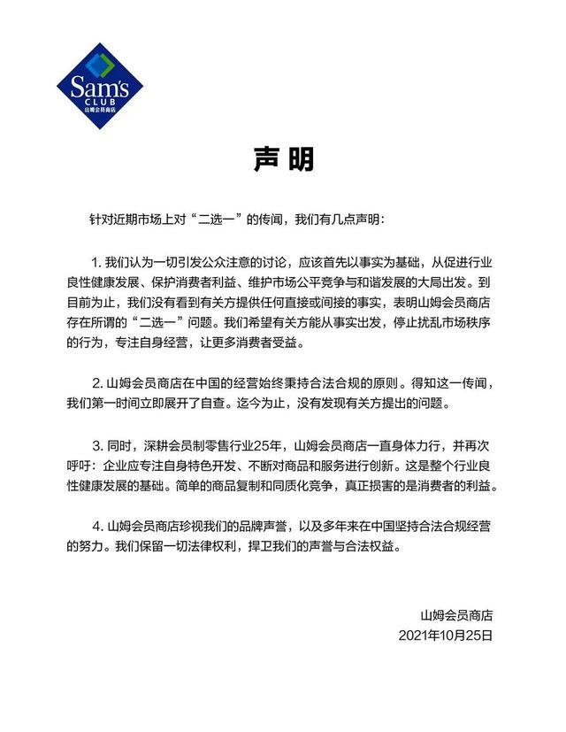 到目前为止,我们没有看到有关方提供任何直接或间接的事实,表明山姆会员店存在所谓的‘二选一’问题。我们希望有关方能从事实出发,停止扰乱市场秩序的行为,专注自身经营,让更多消费者受益。”