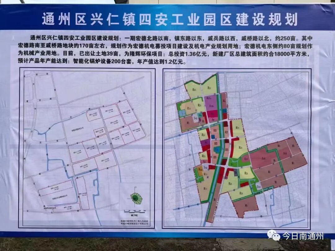 通州区兴仁镇四安工业园区建设规划:一期宏德北路以南,镇东路以东,戚兵路以西,戚桥路以北,约250亩。其中宏德路南至戚桥路地块约170亩左右,规划作为宏德机电募投项目建设及机电产业规划用地;宏德机电东侧约80亩规划作为机械产业用地。目前,已出让土地39亩,为隆辉环保项目:总投资1.36亿元,新建厂区总建筑面积约合18000平方米,预计产品年产能达到:智能化锅炉设备200台套,年产值达到1.2亿元。