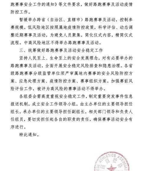 通知分三部分,第一是提高政治站位,强化责任落实;第二是持续做好路跑赛事及活动疫情防控工作,第三是统筹做好路跑赛事及活动安全稳定工作。 疫情以来,体育总局、田协真是操碎了心,文件一个个下。这个通知中,提到相关文件就有五个: 《体育总局办公厅关于暂停给相关体育活动的通知》 《体育总局办公厅关于做好近期体育领域疫情防控和安全生产工作的通知》 《体育总局办公厅关于进一步做好近期体育领域安全稳定工作的通知》 《中国田径协会关于进一步加强田径赛事活动安全监管服务工作的意见》 《中国田径协会关于进一步加强路跑赛事安全工作的通知》