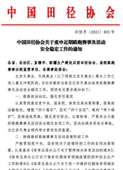 田协于15日发布的《关于重申近期路跑赛事及活动安全稳定工作的通知》,则是为近期的马拉松工作定了个基调。