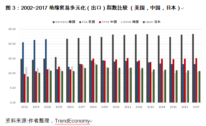 自中国加入WTO以来,中国坚持对外开放的基本国策,把“引进来”和“走出去”更好地结合起来,逐步使中国在经济全球化的历史背景下成为了名副其实的“世界工厂”,中国制造的商品遍布全球各地。过去20年中国地缘贸易多元化指数的变化反映了中国的出口商品组合在全球不同市场和地区已经具有较高的流通性和广泛性(2017年,中国地缘贸易多元化出口指数为15.14)。比较其他全球主要经济体,中国地缘贸易多元化指数已经超越美国、日本及韩国等主要贸易出口国,仅次于德国。