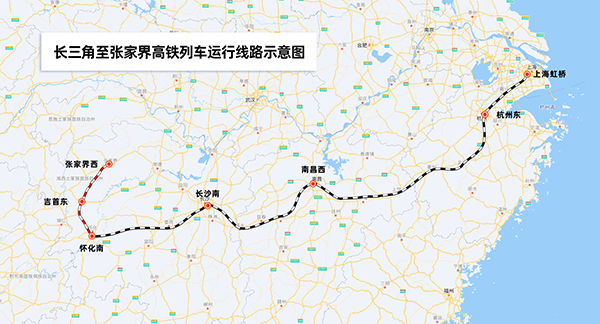 上海虹桥-张家界西G1369/68 G1367/70次列车为复兴号动车组列车,沿途停靠桐乡、杭州东、义乌、上饶、鹰潭北、南昌西、宜春、长沙南、湘潭北、怀化南、麻阳西、凤凰古城、吉首东、古丈西等车站。上海至张家界去程运行时间压缩至9小时06分钟,回程运行时间压缩至8小时46分钟,吉首、芙蓉镇、凤凰古城等旅游文化胜地全面纳入长三角高铁出行圈。