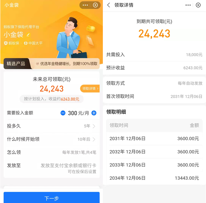 探长读财注意到,近日支付宝上线了一款“小金袋”的理财产品,根据介绍,“小金袋”为支付宝精选产品,稳健增值有保障,50元起投,100元递增,按约定固定利率增值,15天犹豫期内退保全额退。 根据页面提示,“小金袋”产品由太平人寿承保,蚂蚁保险代理销售。支付宝推荐的默认计划为,如果在2021年12月7日开始,每月存入300元(存入最少50元,100元递增),连续存入5年(存入最短5年,最长20年),5年共存入1.8万元,10年后开始领取(最短10年,最长27年),每年发放1笔,一共四笔,到期领取本息24243元。 根据支付宝给出的领取明细,每月存入300元,连续存入5年,10年以后分4年取出本息,累计收益为6243元。这个年化收益什么水平?可能很多人没有概念。 探长读财计算发现,如果按照年化利率4%计算,累计收益为6336元。也就是说,支付宝“小金袋”真实收益率为4%左右。 按照年化利率4%计算,累计收益为6336元,具体计算方法如下: 2021年12月7日-2022年12月6日,每月存入300元,至2022年12月7日累计存入3600元; 2022年12月7日-2023年12月6日,每月存入300元,已存本金3600元,当年收益144元; 2023年12月7日-2024年12月6日,每月存入300元,已存本金7200元,当年收益288元; 2024年12月7日-2025年12月6日,每月存入300元,已存本金10800元,当年收益432元; 2025年12月7日-2026年12月6日,每月存入300元,已存本金14400元,当年收益576元; 2026年12月7日-2027年12月6日,存满18000元第1年,当年收益720元; 2027年12月7日-2028年12月6日,存满18000元第2年,当年收益720元; 2028年12月7日-2029年12月6日,存满18000元第3年,当年收益720元; 2029年12月7日-2030年12月6日,存满18000元第4年,当年收益720元; 2030年12月7日-2031年12月6日,存满18000元第5年,当年收益720元; 2031年12月7日取出本金3600元,2031年12月7日-2032年12月6日,剩余本金14400元,当年收益576元; 2032月12月7日取出本金3600元,2032年12月7日-2033年12月6日,剩余本金10800元,当年收益432元; 2033年12月7日取出本金3600元,2033年12月7日-2034年12月6日,剩余本金7200元,当年收益288元。 2034年12月7日取出全部本金和收益。 探长读财认为,虽然综合年化利率4%并不算高,但正如支付宝给“小金袋”的介绍,可以控制自己不乱花钱,还可以通过每月固定存入,达到强制储蓄的目的。 整体来看,“小金袋”是一款值得推荐的存款储蓄产品,但由于该产品期限长,应合理设置每月存入金额,避免支付宝扣取保费失败的情况。根据支付宝提示,若当期扣款失败,可在宽限期内60天补缴,系统会自动代扣。15天犹豫期内退保全额退,犹豫期外支持随时退保,按现金价值退保,有一定的损失。 与此同时, “小金袋”还提供资金应急解决方案——保单贷款,但保单贷款利率或超过理财年化利率。然而,如果因为保单贷款上征信也影响买房买车,那就有些得不偿失,毕竟“小金袋”产品的定位是资产稳健增值,没必要因为储蓄存款而额外背负贷款。 + @; d* K; W& q4 k% k