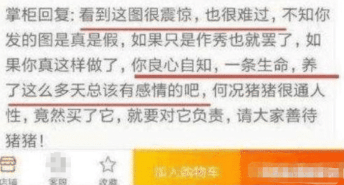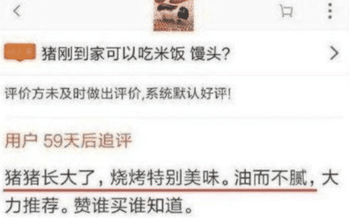 男子买宠物猪后晒烧烤照片:美味,肥而不腻,卖家的回复很直接 现如今我们生活的时代就是一个网路飞速发展的时代,网购已经成为了现在很多年轻人喜欢的一个购物方式了,因为网上购物不仅能够节省我们很多的时间,同时也是能够货比三家买到自己喜欢的东西。网上的店铺几乎已经是将我们生活的吃住用行都是给包括了,甚至还能够在网上买宠物,一般高效率的网站几乎都是上午买下午就到了,可以说是非常的方便快捷了。 小编当时在看到这个消息的时候还以为没有人会在网上去买宠物的,毕竟宠物在运送的途中万一出啥问题就麻烦了,但是没有想到真的是有人会在网上买宠物的,并且还不止一个人。最近网上有一家宠物猪的老板是遇见了一件非常奇葩且无奈的事情,一般在平常将宠物邮寄给买家之后,再告知买家一些平时的注意事项之后几乎都已经是随缘了,但是最近的这个老板在看买家评论的时候是看见了一条评论是让老板是笑不出来了,这是怎么回事呢?让我们一起去看看吧! 我们从照片上是能够看得出来,有一个买家在买宠物猪59天之后在原有的评价上是追加了一条评论,其中这个买家的评论内容就是“猪猪长大了,烧烤起来特别香和美味,肥而不腻!”,这个宠物店的老板在看见这个买家评论的时候也是非常的生气,虽然说这个老板在网上卖的是猪,但是这种猪的品类却是宠物,那里有人在买完宠物之后竟然将宠物给烤着吃了。更过分的还是这个买家竟然还在留言上还配上了一张烤乳猪的图片。 卖家在看见这个评论的时候也是非常的生气,针对买家的这个行为,也是打出了下面的这行字,估计当时的老板在看见这个评论的时候估计心在滴血吧! 这件事上传到网上之后,也是引起了很多网友们的热议,有很多的网友表示这个买家的行为真的是令人心寒,毕竟宠物猪也是一个非常有灵性的生物,要是作秀的话还是能够说的过去的,但是要是真的这样做的话就有点过分了,甚至还有网友表示宠物店的老板就是多管闲事,既然已经卖出去了还管这么多。小编觉得任何的生物都是有灵性的,这位网友不应该这样做,你们是怎么看待这件事的呢?