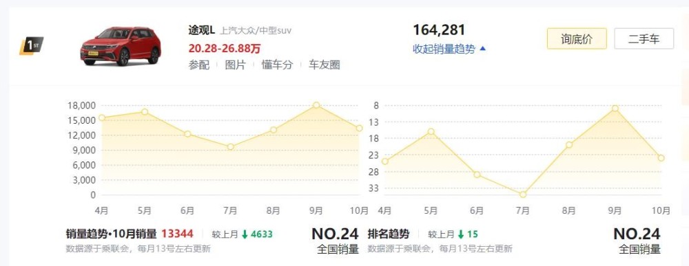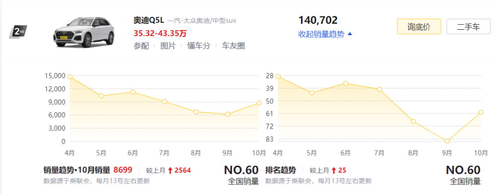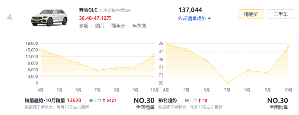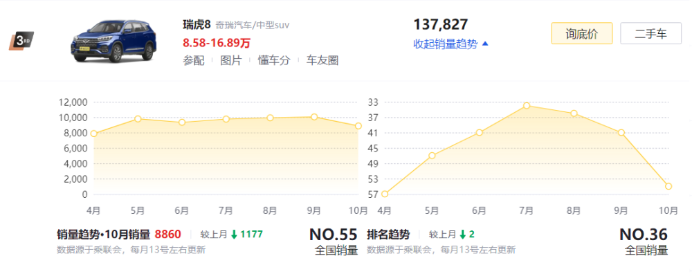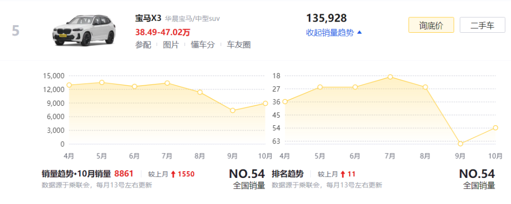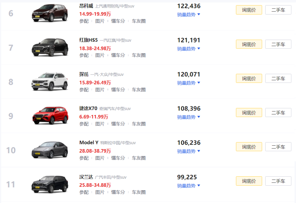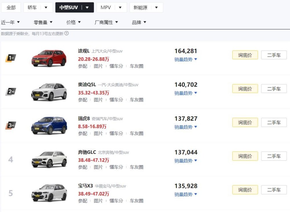 马上就是年底了,许多朋友的买车计划也渐渐地提上了议程。虽说今年各行各业的经济都不景气,汽车主机厂也饱受“缺芯”问题困扰,但我们还是能看到有很多的车型被消费者所认可和喜爱。因此,恰逢年底时节,对于咱们想要买一台中型SUV回家过年的消费者们来说,眼下有哪些车型是值得去入手的呢?今天我就根据最近一年的销量数据,给大家来盘点销量最好的5款中型SUV,也希望在看完这5款最畅销中型SUV后,对你们的购车选择能有指导性的意义。下面话不多说,赶紧一起来看看吧。 第五名,宝马X3 指导价:39.28-47.98万元 近一年销量:135928辆 在最近一年时间里,宝马X3收获了135928辆新车的销量数据,作为一款售价在39-48万元区间的豪华品牌中型SUV,宝马X3能够取得如此优秀的销量成绩,也确实让我们对国人的购买力感到有一些惊叹。当然了,X3要不是足够好,国人也不会花这么多的钱去买它。 从产品本身来说,宝马品牌的光环就摆在那,加上厂家和媒体对X3的宣传一直都是兼顾公路性能与一定越野属性的城市SUV,所以老百姓们在试驾过这款车之后也就更加坚定要购买它的想法了。总言之,宝马X3的产品力还算均衡,对于那些在大城市上班的白领和金领们来说,买一台X3开回老家也绝对不丢面,更何况,一年13.5万位车主都选择了它,你觉得它还能差到哪儿去吗? 第四名,奔驰GLC 指导价:39.98-47.53万元 近一年销量:137044辆 和上面所说到的宝马X3不同的是,奔驰GLC的商务属性更浓,所以买它的人也多多少少是需要兼顾到一定商务社交与面子需求的。不过,奔驰历来就是以豪华感强而著称,加上GLC又是奔驰目前在华最主销的SUV,所以卖的多自然也就见怪不怪了。从销量上来看,奔驰GLC最近一年卖出去了137044辆新车,几乎每月都将近11.5万辆的销量数据表现也让它成为了近一年中型SUV里第四热销的车型。 产品本身来说,奔驰GLC的外观大气商务,内饰虽还没有采用奔驰最新一代设计,但也是豪华感十足。再加上动力起步就是197马力的2.0T发动机+9AT变速箱,而且还提供了全时四驱系统,所以对于那些需要照顾到面子和生意需求的人来说,买一台奔驰GLC也就成为再好不过的选择了。总之,奔驰GLC是这个价位区间里彰显身份的最优解,也正是因此,买它的人才会那么多。 第三名,奇瑞瑞虎8 指导价:9.58-16.8888万元 近一年销量:137827辆 瑞虎8可以说是中国品牌中型SUV里逆袭成功的代表了,要知道,在强手如林的中型SUV,瑞虎8在近一年还能够取得137827辆新车的销量数据表现,并成功超越了宝马X3和奔驰GLC,这样的销量成绩难道还不值得炫耀吗?从产品定位上来说,瑞虎8主打的是那些注重家用、需要大空间同时又追求一定品质的消费者,而通过销量数据也证明,瑞虎8是深受消费者所喜欢的。 就产品本身而言,瑞虎8不仅拥有大气的外观造型、内饰设计也是同级别车型里精致感较为靠前的,再加上奇瑞为其提供了5座和7座车型可选,以及拥有1.5T、1.6T、2.0T等三种不同的动力布局形式,所以这样一款产品力足够均衡、价格又不贵的国产中型SUV自然也就会受到用户所喜爱了。总之,如果你只有15万以内的预算,同时又想买一台综合品质较高的家用SUV,那么瑞虎8确实是一个不错之选。 第二名,奥迪Q5L 指导价:39.68-48.70万元 近一年销量:140702辆 这代奥迪Q5L的风评确实没有上一代车型那么好了,像上代车型所拥有的8AT变速箱、全时四驱在这代车型上都没有了,所以论车型整体的产品实力与名气,这代奥迪Q5L都是有所下降的。那既然如此,为何奥迪Q5L还能够稳坐中型SUV市场销量第二名,以140702辆的近一年零售量成功领先奔驰GLC和宝马X3等直接竞品呢?我觉得,除了奥迪品牌给人们留下的固有印象之外,奥迪Q5L能够卖得好就在于目前终端它所拥有的较大优惠力度了。 要知道,现在购买奥迪Q5L车型最低都能够有4万多的优惠,如果你买的是中高配,优惠还能够去到6万多,所以就这样一个优惠情况,老百姓们想不买都难。再者说了,虽然这代Q5L没了8AT和全时四驱,但7速双离合+2.0T的组合让新车变得更省油了,因此站在大多数用户的角度来说,其实Q5L的变化是无关紧要的。最最重要的是,价格下来了、面子又还在,所以你说奥迪Q5L怎会卖不好呢?想买它的朋友也不妨重点关注一下。 第一名,大众途观L 指导价:21.58-28.18万元 近一年销量:164281辆 说到途观L,这款车历来就卖得非常好。还记得以前的老途观车型吗?那可是合资紧凑型SUV市场里号称“第一个吃螃蟹的人”,如今,途观已经变成了途观L,车型定位也从之前的紧凑型SUV成为了中型SUV。当然了,说途观L是紧凑型SUV也没毛病,毕竟它车长不到4米8、轴距也只有2791mm。不过,站在消费者的角度来说,肯定不希望自己的车没有面子,既然厂家都说是中型SUV了,那用户肯定也愿意接受。 更何况,途观L作为一款德系SUV,不仅拥有德系车的外观质感,空间表现也确实达到了中型SUV的水准,加上动力配比和燃油经济性表现都还不错,所以近一年它能够卖出164381辆新车也就在意料之中了。总之,对于小康家庭来说,如果是想买一台合资品牌旗下的大空间SUV,那么大众途观L依旧是一个不错的选择。销量数据也证明,途观L在中型SUV市场里还是第一名的存在,所以买它并不会吃亏。 通过本期盘点我们会发现,终端所谓“一车难求”的丰田汉兰达在近一年的销量数据中连中型SUV市场前十名都没有能够进入。所以由此也就能够证明,其实汉兰