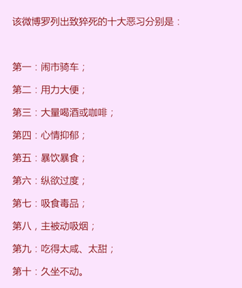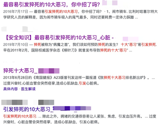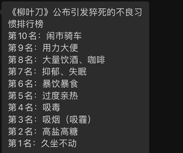 “10大恶习”中的绝大多数确实是不良生活习惯,比如吸烟、大量饮酒、吸毒等等,但如果你看完这“10大恶习”,认为避免在闹市骑车比戒烟对健康更有益,那可就是完完全全的错误解读了。 查证者:冷哲丨生命科学科普作家 最近,有一篇标题为“最容易引发猝死的10大恶习”的文章在网络流传。说到这“10大恶习”,不知道大家此前有没有见过,在一些流传文章中它还被称为“柳叶刀发布的引发猝死10大恶习”。 图注:网络上盛传的“引发猝死的10大恶习”相关文章 图源:网页截图通过网页搜索结果可以发现,类似的传播内容大约从2013年就开始出现了,传播平台也从早年的博客,到个人空间,再到如今的各个社交平台,经久不衰。在传播过程中,一些专业媒体也被这个打着“柳叶刀”旗号的健康忠告所骗,进行了大量转发报道。 图注:不同版本的“引发猝死的10大恶习” 图源:网络截图在不同的流传版本中,内容和排名还经历过一番变动,比如最早的版本中认为“闹市骑车”是最容易引发猝死的,而在最近的网传图片中,这个排名从第一跌落到了第十。 那么真实的情况是怎样的呢?柳叶刀真的发布过这样的内容吗? 一、柳叶刀确实发布过相关研究,但网传的内容存在误读 在众多流传版本中,关于“10大恶习”的来源是这样描述的:2013年6月28日的《南国健报》A23版曾刊发这样一篇报道《致猝死十大恶习排名新出炉》。该报道中称,这是不久前发表在国际权威学术杂志《柳叶刀》上的一项研究,首次对导致心脏病发作的“最后一根稻草”做了排名。 根据这些线索,我们经过一番搜索,找到了这篇论文。 图注:论文原文,标题为“心肌梗死的诱发因素对公共健康影响的重要性——可对比的风险评估” 图源:柳叶刀官网截图这篇论文的题目是“Public health importance of triggers of myocardial infarction: a comparative risk assessment”(心肌梗死的诱发因素对公共健康影响的重要性——可对比的风险评估),实际上,这是一篇关于公共风险因素中,对于心肌梗死诱因的排名。 研究者想要说明的是,诱发急性心肌梗死的因素有很多,如体力消耗、压力事件、暴饮暴食或空气污染的增加。然而,每个触发因素的重要性和相关性都不确定。所以研究团队希望在个人和人群层面上比较这些触发因素,了解哪些因素相对更为重要。 最后,他们得到了公共因素导致急性心肌梗死的一个综合排名: 交通尾气污染(PAF值为7.4%),后面依次是用力过度(6.2%)、饮酒(5.0%)、喝咖啡(5.0%),空气污染(PM10>30μg/m3)(4.8%)、抑郁情绪(3.9%)、发怒(3.1%)、暴饮暴食(2.7%)、情绪过于激动(2.4%)、过度性生活(2.2%)、吸食可卡因(0.9%)、吸食大麻(0.8%)和呼吸道感染(0.6%)。 PAF是一个评估暴露的人群作用的非常常见的流行病学指标,表达的意思是如果某个暴露取消,结局会减少的百分比。 可能很多人在看完这个排名之后非常不解,为什么与吸食毒品相比,交通尾气污染所占比例反而更高呢?这就是我们看原论文时需要特别注意的一点——该研究是从公共卫生角度,评价整个公共因素的,虽然从研究结果来看可卡因所占比例很低(原因是可卡因受到管制以及吸食者人数有限),但就吸食可卡因者个体而言,其心脏病发作危险会增加23倍。 相比之下,空气污染和汽车尾气的数值这么高,原因是暴露于汽车尾气和工厂废气的人群更为庞大。虽然与原文中的“交通尾气污染”相比,“闹市骑车”这个表述显得有些局限和滑稽,很多人看到后也感到非常诧异,但空气质量问题确实是危及大规模人口健康的重大威胁。 总结一下,这项研究旨在通过发现公共风险来为我们的公卫政策修改提供参考,这确实对于个人心肌梗死有一定的意义,但这个排名并不是针对于个人的,不加任何解释和前提条件地把这些因素截取出来流传,就是误导人。“10大恶习”中的绝大多数确实是不良生活习惯,比如吸烟、大量饮酒、吸毒等等,但如果你看完这“10大恶习”,认为避免在闹市骑车比戒烟对健康更有益,那可就是完完全全的错误解读了。 另外,网传的对于柳叶刀文章的解读还忽略了一点,那就是这篇文章是10年前发表的,研究的数据更早,是1960年1月到2010年1月的数据,选取人群大多是欧美国家50-60岁的人群,文章中的人群特征、社会环境等都与当下我国的情况差异非常大。就拿吸食可卡因和大麻来举例,我国与其他国家关于毒品的法案并不相同,在我国毒品是严令禁止的,但在美国,即使是现在,一些地区比如俄勒冈州,持有可卡因也是合法的。原研究中提到的十个因素仅能作为参考,不能全部搬来给我国人群使用。 二、真的有容易引发猝死的恶习吗?如何预防猝死? 我们通常说的猝死指突然发生的自然死亡。心脏血管或呼吸系统、中枢神经系统疾病、药物、酗酒、出血过敏及中毒都可导致猝死,其中最常见的就是心源性猝死。柳叶刀提到的心肌梗死就是心源性猝死的重要原因之一。 心源性猝死常发于患有心脏疾病的人群,包括冠状动脉疾病、心脏瓣膜病等。大量研究发现,心源性猝死的风险因素除了有冠状动脉疾病家族史外,还包括吸烟、高血压、糖尿病、肥胖症等,而这些风险因素并没有一个非常明确的排行。我查阅了多个临床回顾性的分析文献,发现其排行波动较大。只能说以下这些都是较为严重的危险因素,而不能说这个一定更危险,那个不太危险,哪个都不能掉以轻心: “三高”: 患
