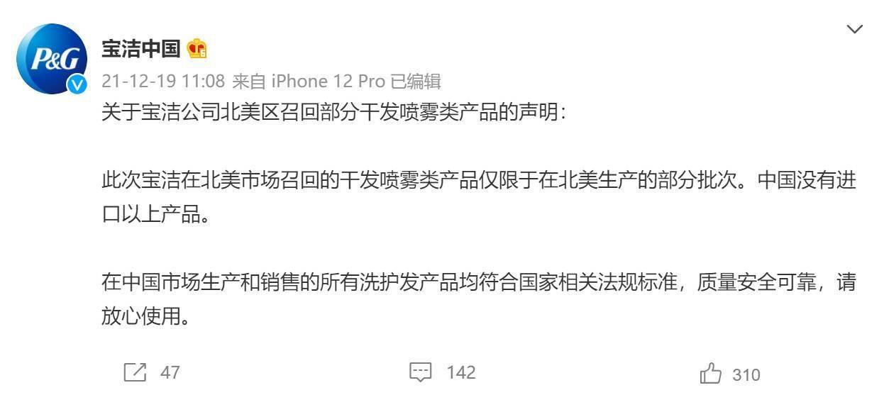 宝洁旗下潘婷等多款产品被检测出致癌物苯 回应:不涉及中国市场 |