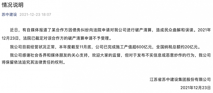 [求助闲聊] 苏中建设回应被申请破产清算:法院裁定不予受理,目前公司经营状况正常 |