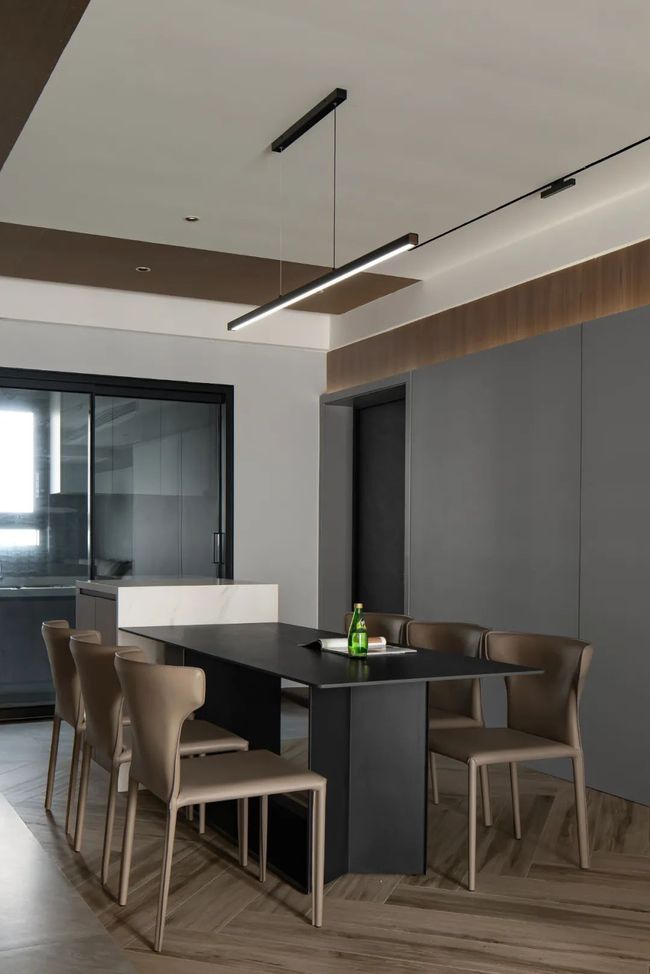 简约实用的长条餐桌搭配卡其色皮质餐椅,高级感十足。