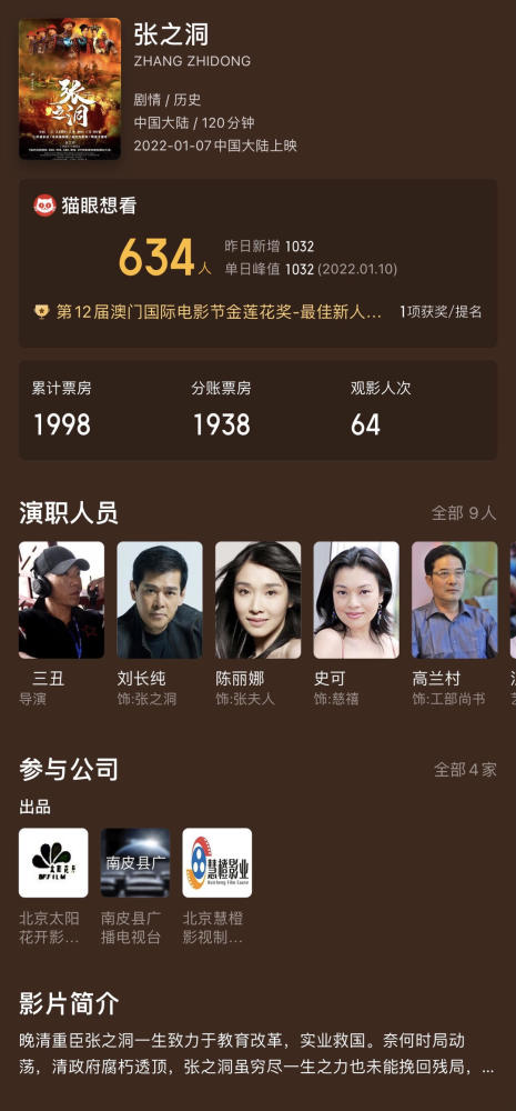 2022春节档的电影已经开启预热,截至1月11日,今年的中国电影市场已经收获了16.58亿的票房成绩,平均每天有超过1.5亿的进账。然而,电影《张之洞》引发网友关注,这部1月7日上映的电影被戏称为“2022年电影票房惨案”,上映首日仅有90元票房,5天累计票房仅有1998元,有网友调侃“影院连电费都不够吧”“群演的工资都不够发吧”。 一方面,影迷获悉电影《张之洞》票房惨淡,在自媒体平台上为电影发声;而另一方面,也有影迷表示不感兴趣,询问“张之洞是谁”。 1月11日,封面新闻记者联系电影的制作出品公司之一北京慧橙影视制作有限公司,工作人员回应称,这是一部历史题材的电影,主创团队的初衷是尽最大努力弘扬张之洞精神,然而电影上映之后遭遇排片少的困境,票房惨淡实属无奈。 在媒体及网友的持续呼吁之下,截至记者发稿前,当天排片增加至56场。 票房惨淡 上映首日仅有90元 “《长津湖》的票房都超过57亿了,竟然还有电影的票房是用元来计算!”电影《张之洞》上映之后排片惨淡,引发网友关注,其中一位网友的留言格外醒目。 2021年,中国电影的欣欣向荣有目共睹,《你好,李焕英》《长津湖》相继迈入50亿票房俱乐部,中国电影总票房和银幕数量稳居世界首位。然而,2022年元旦档的电影还在热映,一部名为《张之洞》的电影却因为票房惨淡牵动人心。 根据猫眼专业版的数据,电影《张之洞》的首日票房仅有90元,累计综合票房仅有1998元,上映5日只有64人次观影。 记者点开购票系统发现成都当天没有排片,随后在成都几家电影院采访时,几位影城经理纷纷表示没有听说过这部电影,最近排片较高的电影分别是元旦档新片《穿过寒冬拥抱你》《反贪风暴5》和《李茂扮太子》。 这部上映之后票房惨淡的电影,陷入了票房低、排片少的恶性循环,从排片数据看更为直观,上映首日还有42场排片,上映次日是个周六,排片骤降至5场,周日只剩2场。 有网友在短视频平台上提出疑问,为这部电影不可思议的低票房发声。不少网友原本想买票支持,却遭遇所在城市没有排片的困境,影迷们发文询问,“很想支持一下,但是没有排片怎么办”。 摘奖 刘长纯等主演让人眼熟 电影《张之洞》由北京太阳花开影视文化有限公司、南皮县广播电视台、北京慧橙影视制作有限公司出品,影片讲述晚清重臣张之洞一生致力于教育改革,实业救国。奈何时局动荡,清政府腐朽透顶,张之洞虽穷尽一生之力也未能挽回残局,最后只得郁郁而终。但他创建的众多军工重工产业和教育学院,却对后世产生着巨大深远的影响。 张之洞是晚清四大名臣之一,洋务派的代表人物,祖籍河北沧州南皮县。据公开资料显示,电影《张之洞》由王蒙及张之洞嫡孙女张厚粲担当顾问,吸引了在《铁道游击队》《绝色双娇》《燕子李三》中有精彩表现的刘长纯出演张之洞,值得一提的是,他曾参演过1996版电视剧《总督张之洞》。此外,还有史可、高玉庆等一批让人眼熟的演员加盟这部电影。 导演三丑(刘冰)是沧州人,对家乡的历史名人张之洞十分熟悉,他曾凭借《张之洞》荣获第12届国际电影节金莲花新锐导演奖。 有专家及名人后人作为顾问,有奖项加持,有老演员积累的观众缘,正常情况之下,这部电影无论如何都不应该卖出90元的首映日票房成绩。 翻开某购票平台软件,有买票观影的网友给出五星好评:“电影还是很棒的,不错的一部历史题材电影,很生动形象地描述了当时清政府的腐败无能和洋务领袖张之洞的卓越才能,是一部值得看的电影!” 排片太少 未来或将搬上网络播放 这部电影为何票房惨淡?出品方能否力挽狂澜?封面新闻记者第一时间联系了排名第一位的出品方北京太阳花开影视文化有限公司,一位工作人员表示:“我们都已经处理完了,该卖的该弄的都处理完了。” 随后,封面新闻记者联系了另一家参与制作出品的北京慧橙影视制作有限公司,工作人员的言语中透露出无奈。这名工作人员说自己昨天睡得很晚,因为《张之洞》是历史题材得电影,“排片有问题,我们没办法,公司也没办法”。 工作人员透露,主创团队的初衷是尽可能弘扬张之洞的精神,让当下的影迷特别是青少年了解张之洞是谁,他发起的洋务运动对当时社会有什么贡献,他创建的众多军工重工产业和教育学院对后世产生了什么影响。 此前,有网友质疑电影的宣发没有跟上,是导致排片低、票房差的主要原因。这名工作人员回应,电影的主创团队都在努力,此前也在南皮县做过一些路演,“我们该宣传宣传,可是影城不给排片,说实话我们非常恼火,但那没办法”。 谈及票房奇低,这位工作人员回应,不仅他们买不到电影票,曾有朋友买到电影票之后被影院退票处理,这让他们十分难过,“想看电影的影迷根本买不到票,排片实在太低了”。这一说法与猫眼专业版的数据吻合,首映日当天有5人次退票,退票原因不得而知。 有网友担心电影《张之洞》票房太低无法回本,这名工作人员透露,主创们带着情怀投入工作,付出很多辛劳,但是低成本,具体的成本“不好意思透露”,“我们努力还原张之洞这个人物,弘扬中华民族传统文化,我们有义务、有责任来做这件事”。谈及网友建议未来上更多网络平台点播,工作人员回应“也会(往这个方向尝试),每个行业有运作的规律,我们也不想发生这样的事情”。