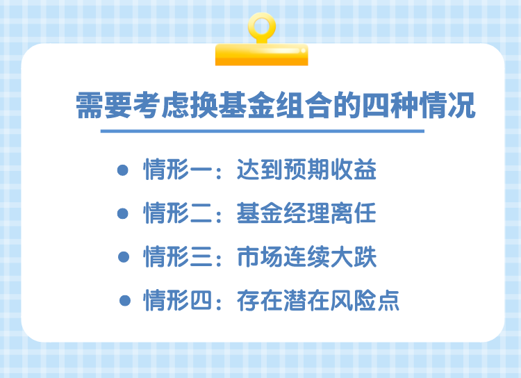 人生有离合聚散,投资有申购赎回,聪明的投资者,除了掌握买点,还要掌握好卖点。对于基金投资来说,投资组合绝对不应该一成不变,定期将自己投资组合拿出来研究、检讨是非常必要的,当然,遇到不靠谱的基金,你也可以考虑换一换了。 投资基金究竟什么时候该离场?这可能是个伪命题,因为谁也无法预测未来,能做的是在合适的时间做点大概率正确的事情。 情形一 达到预期收益 做任何投资,最好在购买之前根据自己实际情况做好投资期限,并定好预期收益率,这样在选择品种和时点把握上更游刃有余。一旦达到预期,投资者可以思考下赎回的问题。 收益率预期不是拍脑门决定的,而是根据目前基金类型、历史收益率、投资期限来定的。比如对于货币基金可以长期持有,但是对权益类基金最好是考虑下进出时间点。 从A股历史表现看,往往牛短熊长,理想的状况当然是熊市低吸,牛市高抛,根据牛熊市做好波段操作,但实际操作却非常难。比如2021年2月份市场高点时,明显买股票基金的投资者要多于赎回的投资者。 因此,投资者不妨划定一个预期收益率,如果申购的是权益类基金,可以考虑设置止损或者止盈点,比如收益率超过20%就选择赎回20%份额,收益超过50%赎回50%份额,收益率越高越加大赎回力度。或者根据市场点位来进行赎回,比如处于历史高位持有较少权益类基金,并布局固定收益类产品,而3000点附近则可以选择适度布局偏股基金。 相对于一次性基金投资,基金定投更适合做“止盈类轮动布局”。在基金定投时需要设置一个止盈的指标,比如定投收益率60%以上,或者标的指数涨幅超100%,一旦触发了止盈的指标就选择全部赎回。但是,基金定投不用停止,因为即使有几笔买到高点,但因为总额不大、对捕捉下一轮牛市高收益影响不大,这样也可以避免择时。就如同一个最简单的投资图:开始定投——收益率超60%赎回已有份额——继续基金定投——收益率再超60%提交赎回已有份额,同时继续进行基金定投。 情形二 基金经理离任 可以说,基金经理是基金的“灵魂”,一旦基金经理离职,投资者是否选择赎回是一个问题,这要具体问题具体分析。 第一看基金类型。指数基金、货币基金等工具型产品,基金经理离任对业绩的影响较小,如果市场没有明显的变化,仍可以继续持有该类基金。而对于主动管理类基金,更换基金经理可能影响较大,但也不可盲目赎回。最好的办法是关注3个月左右时间,看看基金业绩情况,若业绩稳定、波动率低,可以考虑继续持有。 第二看基金经理知名度。真正对持有人影响较大的是明星基金经理离职,比如某大公司的明星基金经理离职后,他曾管理明星基金从此前业绩领先到“离职”后业绩垫底,这样的影响就巨大,因此投资者更需要关心的是明星基金经理的去留。 第三,普通投资者可以观察机构的做法。从过往数据来看,一旦明星基金经理发生变更,机构一般都会选择赎回,也有部分机构会根据接替人选来做布局。如某家基金公司明星投资总监离任后,半年之间规模锐减97%,还有一些明星基金经理离职后,机构份额减少50%左右,若机构撤出幅度很大,建议散户也慎重考虑是否还要持有基金。 情形三 市场连续大跌 市场连续大跌,是该选择赎回基金么?这一问题经常出现在各大论坛上,也是投资者最为关心的问题。不如看基金净值波动率来选择是否赎回。 基金波动率是一个很好的参考指标,最好选择波动率低的基金。为什么这么说?举个极端的例子,基金A和基金B,A基金净值自设立以来稳步上涨,两年内从1元涨到2元,而B基金第一年从1元涨到1.8元,第二年从1.8元跌到1元,然后涨到2元。但持有基金A的心态要比持有基金B好很多,也更容易长期持有。 “若市场出现2%的平均上涨,但是单只基金下跌超6%,这种情形出现较多的基金,也值得谨慎。”一位第三方机构人士表示,普通投资者最好选择风格稳健的品种。这说明基金持股与市场偏离度较高,或是重仓一些“地雷股”,值得警惕。 对于一些业绩长期不佳的基金,最好是敢于止损。很多投资者一开始选择基金时并没有做好功课,若持有之后便一直亏损,更是舍不得“割肉”。其实应该依据自身风险承受能力设定止损线。 不过,看今年这样震荡市场格局下,不必太在意基金净值的短期波动,最好的办法做好配置,多看少动。 情形四 存在潜在风险点 做投资风险点往往是存在细节中的,因此对于持有基金的投资者来说,需要关注一些潜在的风险点。 第一,规范、透明、合规运作是基金公司良好运作的基础,因此被监管机构处罚过的基金公司的旗下品种,投资者需要谨慎。需要注意基金公司为何受处罚,基金公司针对处罚随后措施等,最好选择风控较好的基金公司旗下品种。 第二,从单只基金角度看,持有停牌股较多其实也存在一定风险。据悉,历史上就曾出现某只基金持有单一停牌股比例较高,但同时遭遇大额赎回,导致该基金持有停牌股比例超40%的现象,请注意,基金并没有按时进行估值下调,这对于持有时间越长的基民,造成的伤害越大,因此,对于持有停牌股较多的基金,考虑到可能出现的流动性风险或影响该基金业绩,投资者要慎之又慎。 因此,投资者需要关注下单只基金前十大重仓股中停牌股数量,最好持有比例不要超过20%,尤其是对于一些规模较小的偏股基金需要格外注意,建议不要长期持有规模在1亿以下的权益类