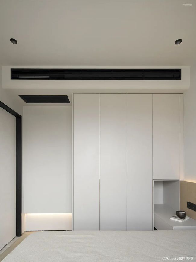 次卧衣柜和床头柜一体,开放格可以放置睡前读物,通高衣柜做满墙,收纳墙大实用,视觉上干净整齐。: J# H, }* S$ ]' s6 J3 y