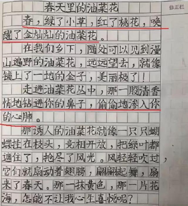 谈到小学生的作文,作为成年人,大多数人都不是特别关注,在大家的印象中,小学生一般都不会写什么很好的作文。小学生的作文,往往都是流水账,没有什么值得关注的点。而通常情况下,老师批改小学生的作文,都是看有没有错别字,字数够不够?语句通不通顺?如果语句通顺,有没有错别字,字数达标,这样的作文,往往都能够得高分。可是,小编最近在网上看到的一篇很火的小学生作文,却颠覆了小编对小学生作文的固有印象,现在,就让我们来看看。 看到这篇小学生作文,你的第一印象是什么呢?小编的第一印象就是,字写得真好。真的,小编写了这么多年的钢笔字,但是,看到这篇小学生作文的字体,感觉就像是印刷体一样,甚至比印刷体还要好看。可能很多人不知道,在过去,有些人就是因为写字好,被调入机关工作。当年,小编在读中专的时候,有一位老师,因为写字好,差一点被当地的教育局调过去工作了。而这位小学生的字体,小编觉得,很多成年人都要自愧不如。 除了写字写得像印刷体,这篇小学生作文,构思和立意,都非常好。第1句话就非常有意境——春,绿了小草,红了桃花。有没有一种春意盎然、扑面而来的感觉呢?而接下来这一句,就让我们感受到了这种春意盎然和扑面而来。接下来,这位小学生写的是金灿灿的油菜花。谈到春天,小编第一印象中,最印象深刻的,也就是春天里那漫山遍野的油菜花,油菜花的清香,油菜花的竞相开放,油菜花和春风的互动,在一瞬间,这些情景都浮现在了小编的脑海之中。 看了这位小学生的作文,小编觉得这篇作文,像一首诗、像一幅画。小编自己读小学的时候,感觉根本写不出这样的意境,而这位同学,还仅仅是一名二年级的同学,更让小编汗颜。小编觉得,这位孩子的老师是幸运的,有这样的一位孩子,写出这么赏心悦目的字体,写出这么让人心旷神怡的美文,作为语文老师,真的是三生有幸。而小编更羡慕这位孩子的家长,自己的孩子,作文写得这么好,可以说,前途不可估量,父母也可以少操心。