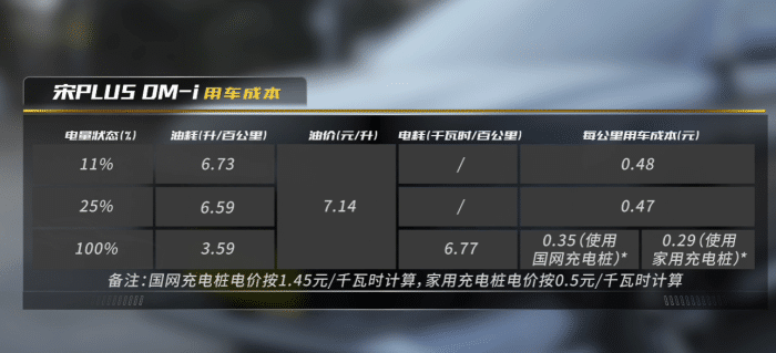 / b6 O: `: r' T9 k# _* C如果我们引入等效油耗的概念,再看某车帝给出的评测数据就会发现,三次测试的油耗数据相差很大: 11%电量充到25%,意味着充了14%的电,宋PLUS DM-i旗舰型总电量为18.3度,也就是说充了2.56度电,那么这一次的能耗为6.73L-2.56kWh,将3度电折合成1L油,等效油耗为5.88L。因为充的2.56度电,还能让车继续跑个二三十公里,必然要拉低的百公里油耗。 25%电量,用了1%的电,那么等效油耗则为6.65L。 100%电量,3.59L+6.77kWh,等效油耗为5.84L。