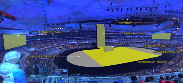 而冰立方面积为约为700多平方,冰瀑面积约为1200多平方,南北两块看台屏幕一共1000多平方,均由利亚德提供。