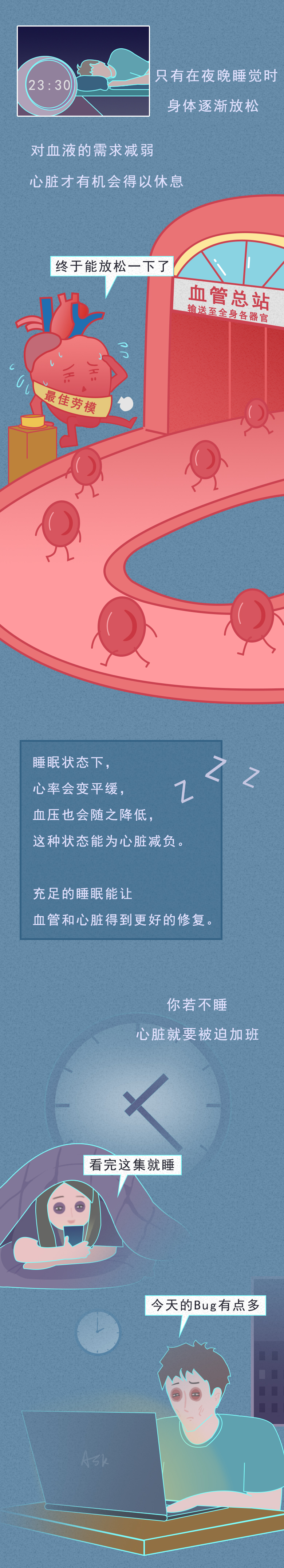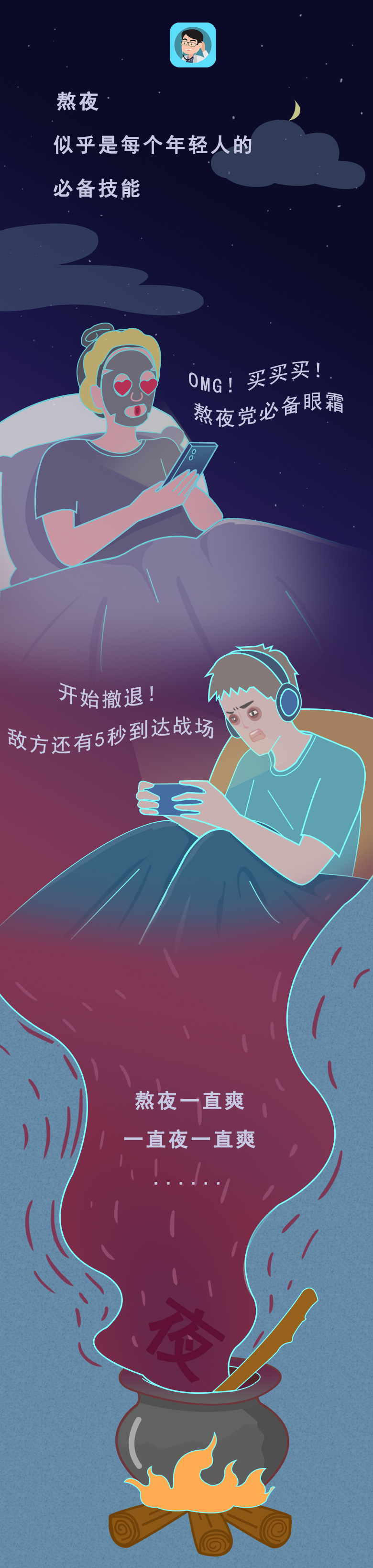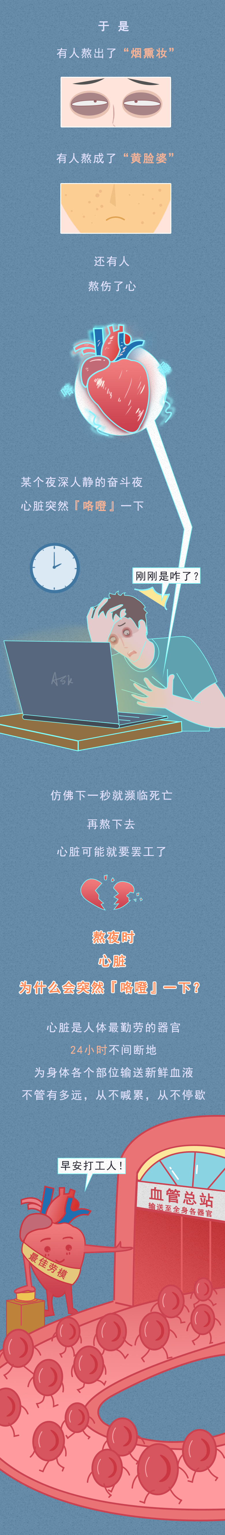 对于年轻人来说,熬夜已经成为他们的专属代名词。 正所谓:熬最晚的夜,用最晚的眼霜,也已经成为他们的共同认知。 为何那么多人喜欢熬夜呢? 曾经网络论坛上就有一个高赞回答----大概只有晚上的时候才能抓住时间吧! 白天的我们总要面临那些没完没了的加班,以及领导突如其来的拷问,再加上各种人际交往等,都不断蚕食着我们少得可怜的个人时间。 好不容易钻进被窝,当我们在说晚安的时候,并不代表真的睡着了,而是在告诉我们:我要进入一个只属于自己的私人空间。 因此,到了夜幕之际,我们能够在专属自己的黑夜中喘口气,刷微博、看电影、开黑打游戏,又或者看各种小说...... 唯有自己在这段时间内,偷偷搭建只属于自己的精神基地。 熬夜并不能让我们身体变得更好,反而形成一个恶性循环 暂时的不眠,或许会让我们能够感受到放松和快乐。 但长期如此,却只会逐渐消耗自己的精力,让白天的自己越来越忙,睡得越来越晚,生活也变得越来越无趣。 正如村上春树在《眠》中说的那样:"睡眠,对于人来说,那既是肉体的休息,也是精神的休息。 熬夜,又是如何不断蚕食着我们的健康呢? 或许,这张图能告诉你一切: 对于被千难万难包围的成年人而言,几乎很难再拥有小时候那一份纯粹的快乐。 随着年龄增长,压力和负担也逐渐增多。 无论是找一份高薪体面的工作,又或者是存钱买车买房,还是找一个合适的结婚对象,都可以成为一项又一项的阶段性任务。 也正因如此,面对枯燥且机械的生活,谁都不甘草草入睡,宁可牺牲自己健康,也想要在黑夜中换取一份精神食粮。 但这种牺牲,却并不划算。 适当的放松可以缓解身心疲惫,但过度的放纵却是在消耗自己健康。 人的精神从来并不靠手机来放松,而是需要睡眠进行滋养,充足的睡眠才能够让我们有更好精神和精力去做自己喜欢的事。 所以,提醒各位朋友们:在夜幕里沉沦久了,也别忘记欣赏白昼的风景。 7 Z& R, m1 r; ]: \' o