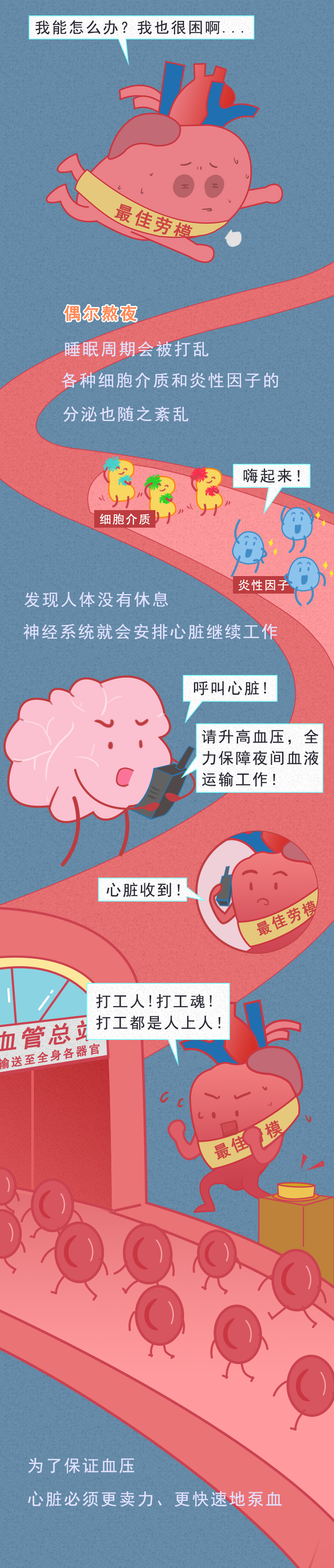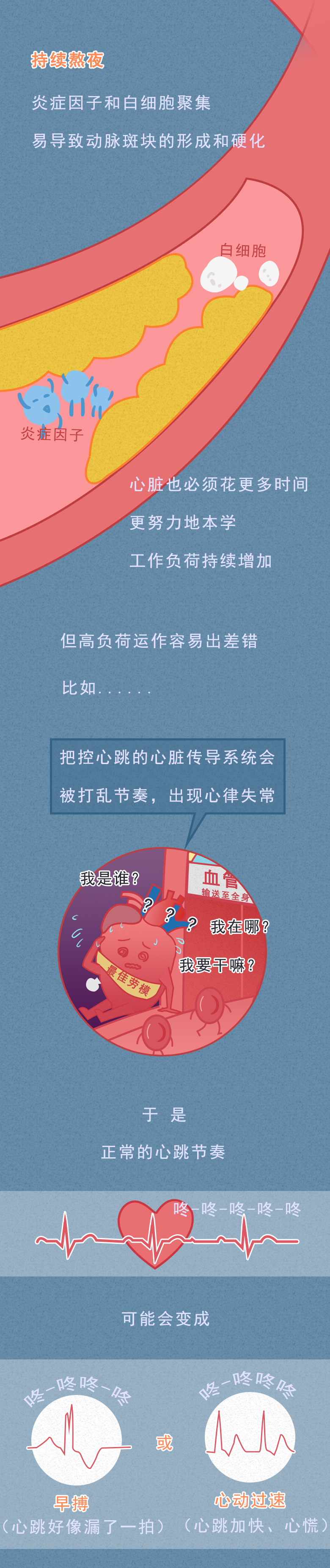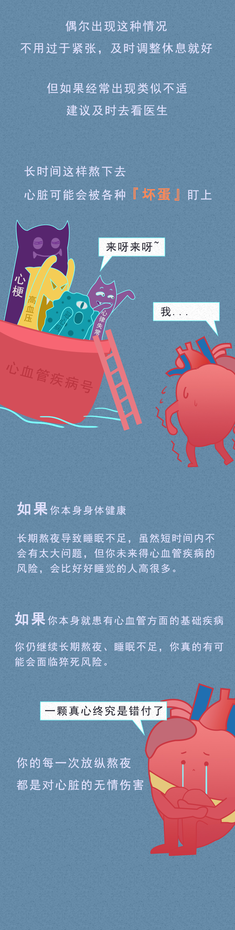对于年轻人来说,熬夜已经成为他们的专属代名词。 正所谓:熬最晚的夜,用最晚的眼霜,也已经成为他们的共同认知。 为何那么多人喜欢熬夜呢? 曾经网络论坛上就有一个高赞回答----大概只有晚上的时候才能抓住时间吧! 白天的我们总要面临那些没完没了的加班,以及领导突如其来的拷问,再加上各种人际交往等,都不断蚕食着我们少得可怜的个人时间。 好不容易钻进被窝,当我们在说晚安的时候,并不代表真的睡着了,而是在告诉我们:我要进入一个只属于自己的私人空间。 因此,到了夜幕之际,我们能够在专属自己的黑夜中喘口气,刷微博、看电影、开黑打游戏,又或者看各种小说...... 唯有自己在这段时间内,偷偷搭建只属于自己的精神基地。 熬夜并不能让我们身体变得更好,反而形成一个恶性循环 暂时的不眠,或许会让我们能够感受到放松和快乐。 但长期如此,却只会逐渐消耗自己的精力,让白天的自己越来越忙,睡得越来越晚,生活也变得越来越无趣。 正如村上春树在《眠》中说的那样:"睡眠,对于人来说,那既是肉体的休息,也是精神的休息。 熬夜,又是如何不断蚕食着我们的健康呢? 或许,这张图能告诉你一切: 对于被千难万难包围的成年人而言,几乎很难再拥有小时候那一份纯粹的快乐。 随着年龄增长,压力和负担也逐渐增多。 无论是找一份高薪体面的工作,又或者是存钱买车买房,还是找一个合适的结婚对象,都可以成为一项又一项的阶段性任务。 也正因如此,面对枯燥且机械的生活,谁都不甘草草入睡,宁可牺牲自己健康,也想要在黑夜中换取一份精神食粮。 但这种牺牲,却并不划算。 适当的放松可以缓解身心疲惫,但过度的放纵却是在消耗自己健康。 人的精神从来并不靠手机来放松,而是需要睡眠进行滋养,充足的睡眠才能够让我们有更好精神和精力去做自己喜欢的事。 所以,提醒各位朋友们:在夜幕里沉沦久了,也别忘记欣赏白昼的风景。 7 Z& R, m1 r; ]: \' o