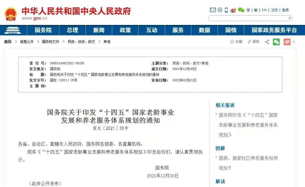2022年2月21日,国务院印发《关于印发“十四五”国家老龄事业发展和养老服务体系规划的通知》,这份一万八千多字的通知,对我国“十四五”期间养老事业和养老服务作出全面的规划,其中大家最为关注的是提到“实施渐进式延迟法定退休年龄”。
