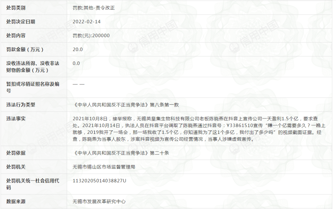 大家可能都听过一句话“吹牛不报税”,不过,吹牛要看场合,搞不好还真要被罚款! 江苏省无锡市一家公司的老板因为一句话付出20万元的代价。 近日,信用中国披露了一则无锡英皇集生物科技有限公司(下称“英皇集科技”)的行政处罚信息。 据披露信息,去年10月8日,有人向无锡市锡山区市场监督管理局(下称“市监管局”)举报,英皇集科技的老板陈晓燕在抖音上宣传公司一天盈利1.5个亿,要求查处。 经过市监管局的调查,陈晓燕为当事人股东,涉案抖音视频为宣传公司经营情况,当事人涉嫌虚假宣传。 最终,因违反《中华人民共和国反不正当竞争法》第八条第一款,该公司被罚款20万元并被责令改正。 截图自信用中国官网 江苏无锡英皇集科技老板陈晓燕为其吹牛付出了20万元的代价,在网上引发热议。受到处罚的陈晓燕事后吐槽:“真的搞笑,吹牛也犯法吗?”殊不知,吹牛吹过了头,一不小心也会触碰法律红线。 《中华人民共和国反不正当竞争法》第八条明确: “经营者不得对其商品的性能、功能、质量、销售状况、用户评价、曾获荣誉等作虚假或者引人误解的商业宣传,欺骗、误导消费者。”该法第二十条规定:“经营者违反本法第八条规定对其商品作虚假或者引人误解的商业宣传,或者通过组织虚假交易等方式帮助其他经营者进行虚假或者引人误解的商业宣传的,由监督检查部门责令停止违法行为,处二十万元以上一百万元以下的罚款;情节严重的,处一百万元以上二百万元以下的罚款,可以吊销营业执照。”