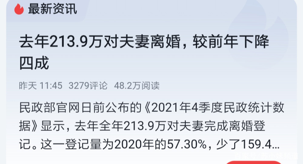 民政部官网日前公布的《2021年4季度民政统计数据》显示,去年全年213.9万对夫妻完成离婚登记。这一登记量为2020年(373.3万对)的57.30%,少了159.4万对。 数据显示,更早前的2019年,404.3万对夫妻完成离婚登记,2018年有380.1万对夫妻完成离婚登记,2017年的这项数据为369.3万对。 也就是说,仅从整体数据来看,2021年的离婚率较过去几年,有明显下降趋势。 这个数据,让很多网友感到意外。 因为如今,许多90后,00后不愿走入婚姻,这已成一种趋势,而离婚率年年攀升,也是不争的事实。 许多网友认为,2021年离婚率下降,只是从数据上来看,实际上,客观来说,离婚率其实还是在上升的,只是表现得比较隐晦。 因此,众多网友自发在评论区展开讨论,分析2021年离婚率为何从数据上来说下降的原因。 总体来说,一众网友认为,最影响离婚率数据的有4个因素。 一、离婚冷静期的作用 关于2021年整体离婚率下降,也有不少地方民政部门从数据分析比对,认为是“离婚冷静期”的作用。 2021年1月1日,《中华人民共和国民法典》正式实施,离婚登记设置30日的“冷静期”。 因此,多地此前公布2021年婚姻大数据时,均将离婚登记减少的主要原因归于离婚“冷静期”的实施。 但实际上,对“离婚冷静期”,也有不少网友持不同态度。 关于这一部分,笔者认为,万事有利有弊。关键还要看它的弊端跟好处,哪个更大一些。 不管怎么说,从近几年的离婚结婚数据来看,越来越多的年轻人不愿意走入婚姻,离婚人数几乎每一年都在攀升,确实是一个事实。 但在刚刚过去的2021年,由于《民法典》离婚冷静期的实行,以及疫情的影响,房地产市场整体遇冷,离婚率的确比起过去几年有大幅度下降。 正如一位网友说的:未实行冷静期前复婚率很高,冷静期实行以后,复婚率大大减少,因为都是经过冷静思考的,基本不会复合了。 的确,离婚冷静期的实行,除了让那些冲动离婚的夫妻,经过30天的冷静思考之后,变得不那么冲动,更加理性; 另外一个作用,就是,一旦30天冷静期过后,还是坚持要离的,那也基本上是深思熟虑的考量,一旦离婚,那么后面再复婚的可能性就很小了。 二、疫情之下,男女双方各自艰难,先凑合一下,熬过这段时期再说 许多网友认为,因为过去的一年,疫情笼罩,所以,无论从男方还是女来说,离婚之后,一个人的收入不足以保证自己的生活。 所以基于此种原因,许多人选择按兵不动,静静蛰伏,等到疫情过去,自己经济状况好转,再提离婚也不迟。 不得不说,这确实是一个很现实的原因。因为即使目前婚姻不幸福,想要离婚,现在也确实不是最好的时机。 有网友甚至把离婚比喻成跳槽,认为经济不景气的时候,即使是对目前的工作不满意,大部分人仍会选择继续坚持一下,忍耐一下,等到经济环境好转了再跳槽。这话确实也不无道理。 三、结婚的人少了,所以离婚数据自然也下降了 关于离婚率下降,有部分网友认为,这几年,愿意结婚的年轻人越来越少了,所以结婚人数的下降,导致离婚人数也有所下降。 的确,由于年轻人的思想、经济越来越独立,所以对于结婚的需求,是确实有所减少。 尤其是女性,很多人觉得不结婚,自己一个人过得自在。可是如果选择结婚,婚后家务、孩子这些,再加上由于生孩子,带孩子,不能出去工作,如果再遇到一个不够体贴,不够同理心的另一半,那确实是种煎熬。 另外,从2021年相关研究机构发布的数据来看,2020年离婚的人群中,主动提出离婚诉求的,基本女性居多,占到总离婚人数的73.4%。 所以,由此看来,女性对婚姻的期望值降低,确实成为近些年,结婚率下降,离婚率有所上升的一个主要因素。 四、房地产遇冷,假离婚买房的少了 还有一种说法,也得到不少网友支持,那就是,有人认为,因为去年整体来看,房地产市场没那么火爆了,所以相较过去几年,假离婚来买房的人数减少了。 不得不说,这的确也是一个因素。 在房地产爆火的那几年,借着假离婚,换取买房名额,确实是不少夫妻离婚的一个原因。尤其在购房名额越少的城市,这样的情况可能越明显。 写在最后 整体来看,2021年离婚率下降,是由于“离婚冷静期”、疫情影响、房地产市场遇冷等诸多因素共同作用的结果。 2022年,不排除离婚率还有上升的趋势。 不过也有不少网友认为,结婚率下降,离婚率升高,这是很多发达国家都会有的现象,所以未必就是坏事。 不过对于婚姻这件事,人们如今的确越来越抱持开放的态度。 毕竟,相比较活出自我,让自己幸福而言,婚姻的重要程度的确没以前那么重要了。 ; ?. M( }! W, _- s1 `* b