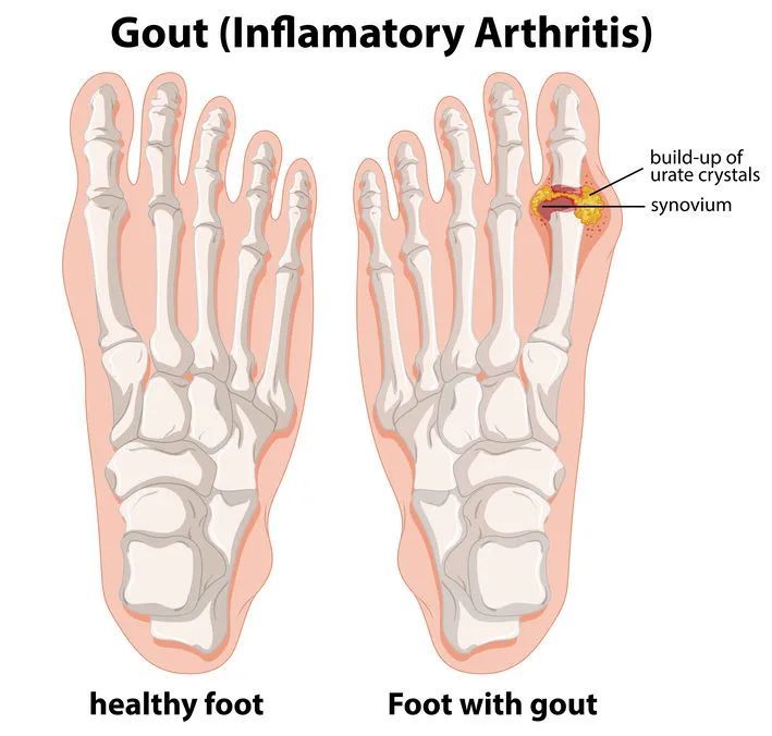 许多人认为,痛风是“天下第一痛”,足以让人痛到撕心裂肺,甚至到怀疑人生。 因此很多患者在痛风发作后,都会吃一堑长一智,在日常生活中注意控制饮食中尿酸的摄入、减轻体重、多喝水等等。 还可能有些人,虽然在体检时发现尿酸升高,但没有任何关节疼痛的症状,平时就不是特别重视饮食和生活习惯。 其实,无论是否出现了痛风发作,都应该将尿酸控制在理想范围。而且,除了要预防痛风的发生发展外,也需要预防相关并发症的发生。 控制尿酸的重要性 我们知道,高尿酸血症是指正常嘌呤饮食状态下,非同日两次空腹血尿酸(SUA)水平>420 μmol/L。大多数高尿酸血症患者是无症状的。 高尿酸血症和痛风的进展有四个病理生理阶段: 高尿酸血症的发展:血尿酸水平控制不佳,长期处于升高状态。 尿酸盐晶体的沉积:约25%的高尿酸血症患者有尿酸盐晶体沉积,可以通过影像学检查来确认。出现尿酸盐晶体沉积被认为是痛风发生发展的重要节点。 痛风发作:由沉积晶体的急性炎性反应而引起,主要诱因有高尿酸饮食(喝啤酒、吃烤串、大量进食动物内脏、鱼汤、肉汤等)、关节损伤、局部温度降低、局部pH值降低、疲劳等。 以痛风石为特点的疾病晚期:痛风反反复复发作,出现严重的关节畸形等情况,严重影响日常生活。 有研究显示,在中国有13.3%人出现了高尿酸血症,但只有1.1%的人患有痛风。虽然高尿酸血症是痛风发展的“必经之路”,但也有相当一部分高尿酸血症患者不会发展为痛风。 有研究指出,即使在患有严重高尿酸血症(≥600 mol/L)的人群中,在15年里也只有不到一半人会患上痛风。 但需要注意的是,血清尿酸升高是痛风发展的重要危险因素,而且血尿酸越高,痛风发作的概率越大。 研究已证实:血尿酸≥600 μmol/L时痛风的发生率为30.5%,血尿酸 因此,在《中国高尿酸血症与痛风诊疗指南(2019)》中明确指出,建议所有高尿酸血症与痛风患者知晓并终生关注血尿酸水平的影响因素,始终将血尿酸水平控制在理想范围。 指南中指出,将血尿酸水平控制在240~420 μmol/L内,可明显减少痛风的发作频率、预防痛风石形成、防止骨破坏、降低死亡风险及改善患者的生活质量。 另一项在《柳叶刀-风湿病学》(The Lancet Rheumatology)发表的研究也再次强调了,无论有没有症状,血尿酸的控制都非常重要。研究结果显示,当血清尿酸浓度持续平均 此外,痛风的危害远远不止局部关节(如脚、脚踝和膝盖等关节)出现红肿热痛,高尿酸血症和痛风也是慢性肾病、高血压、心脑血管疾病及糖尿病等疾病的独立危险因素,还是过早死亡的独立预测因子。 ▲痛风发作主要影响下肢关节(图片来源:123RF) 这些并发症的预防同样重要 痛风是一种复杂的代谢性、炎症性疾病。许多证据表明,高尿酸血症和痛风是多系统受累的全身性疾病,往往与多种疾病的发生发展密切相关。 除了关节症状外,也是代谢综合征、2型糖尿病、高血压、心血管疾病、慢性肾脏病、肾结石、骨质疏松、睡眠障碍等多种疾病发生发展的危险因素。接下来就简单介绍4种常见并发症。 01 肾结石 肾结石是痛风最常见的并发症之一,大约影响五分之一的痛风患者。这是因为尿酸盐结晶可能会聚集在痛风患者的尿道中,从而促进肾结石的形成。 出现肾结石,患者可能会有以下症状: 肋骨下方侧面和背部产生剧烈疼痛; 解小便时痛; 出现粉红色、红色或棕色尿液; 疼痛可能会放射到下腹部和腹股沟。 02 心血管疾病 痛风会导致关节和身体其他部位发炎,而炎症也是心血管疾病的危险因素之一,因此痛风和心血管疾病通常同时发生。 有研究发现,与从没患过痛风但有心血管疾病的患者相比,患痛风的人死于心血管疾病或中风的风险增加了15%;痛风患者发生心力衰竭而死亡的风险增加了2倍。 而且,在阻塞性冠状动脉疾病患者中,有痛风病史通常与患者更糟糕的预后相关。虽然可以使用心血管疾病药物来治疗,但药物治疗也无法解决痛风带来的心血管风险。 图片来源:123RF 03 糖尿病 有研究指出,痛风患者患糖尿病的风险高于非痛风患者,而且该结果与参与者的体重、生活方式(吸烟喝酒等)等其他已知风险因素(高血压、高脂血症等)无关。 研究者认为,痛风可能与糖尿病风险增加独立相关,并且女性的关联程度明显大于男性。这可能是因为,痛风患者体内有持续的低度炎症,从而可能促进糖尿病的形成。 04 骨折 痛风患者更容易出现骨质减少和骨质疏松症,从而增加骨折的发生风险,尤其是女性。有研究发现,痛风患者的总体骨折率接近23%,远远高于没有患痛风的人。 研究中分析,痛风和骨折有关的原因可能有三点: 首先,痛风本身就会增加下肢和脊柱骨折的风险。 其次,高尿酸血症可能会引起严重的急性关节炎,炎症标志物的产生可能与骨密度的变化和吸收有关。 最后,尿酸本身对氧化应激也有影响,氧化应激可能会启动破骨细胞活化,从而影响骨质、增加骨折风险。 研究者指出,痛风的预防和治疗对骨质疏松症患者有重要意义。 此外,痛风可能会严重影响患者的心理和社交健康。如果患者的血尿酸水平控制不佳,就可能会反复出现痛风发作的情况,慢性疼痛可能会导致患者出现压力、焦虑和抑郁等情绪。 而且,痛风发作时会引起剧烈疼痛,使患者难以四处走动、完成日常工作和社交,从而对患者的日常生活产生巨大影响。 5 Z" S% a$ u. z2 e