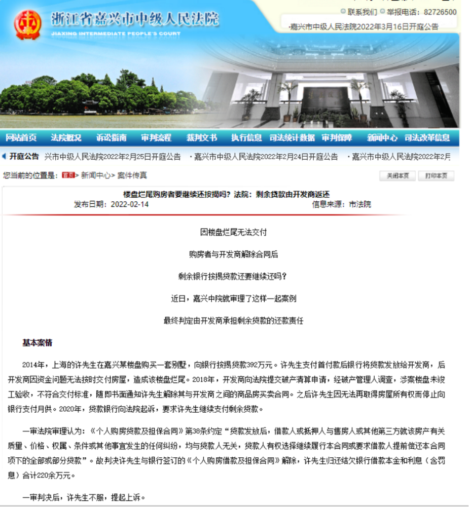 近日,漳州泰禾厦门湾小区业主被某国有银行催收的视频搬上了网络,引人关注。泰禾集团因资金链断裂,旗下子公司泰维置业有限公司开发的泰禾厦门湾目前烂尾,虽然目前竭尽全力推动项目复工,但问题颇多,难度很大。 01 每个面临“烂尾”风险的楼盘,似乎都有着相似的轨迹。 项目传出资金问题——施工工人减少——工程进度缓慢——直接停工——业主发现问题维权——开发商多方努力争取复工——开发商再发通知延期…… 幸运的资金问题得到解决,楼盘复工、延期交房;不幸的,楼盘复工遥遥无期,交房无望。 对普通百姓而言,买房是一场输不起的豪赌。而比买不起房更绝望的,是买到了烂尾期房。 那么房子烂尾了,买房人为什么还要还房贷?能不能断供停贷? 这个问题相信很多人都问过,得到的答案更多的都是只要买了房,不管房子处于何施工阶段,房贷该还还是要还。 因为买房是业主和开发商之间的交易,但贷款是业主与银行之间的往来。业主和银行之间的债务关系已经形成。 如果开发商烂尾了,那你可以起诉开发商,可以找开发商索赔,但这和银行没有关系,银行贷款给的是你,然后你给了开发商,法律关系清清楚楚,干净明了。 但已经走到烂尾地步的开发商还有能力赔偿吗? 最后出走了一圈,又转了回来,最后买单的还是购房者。 买到烂尾楼的购房者已经很惨了,损失了半辈子的积蓄,没道理还要搭上下半辈子的一切。 那有没有房子烂尾,贷款不还的成功案例? 02 近期,浙江省嘉兴市一个烂尾楼引起一个购房者拒还银行贷款的民事纠纷,法院却有了完全不一样的判决结果,也让遇到同样情况的购房者,在判决中看到了新的希望。 2014年,上海的许先生在嘉兴某楼盘购买一套别墅,向银行按揭贷款392万元。许先生支付首付款后银行将贷款发放给开发商,后开发商因资金问题无法按时交付房屋,造成该楼盘烂尾。 2018年,开发商向法院提交破产清算申请,经破产管理人调查,涉案楼盘未竣工验收,不符合交付标准,随即书面通知许先生解除其与开发商之间的商品房买卖合同。 之后许先生因无法再取得房屋所有权而停止向银行支付月供。2020年,贷款银行向法院起诉,要求许先生继续支付剩余贷款。 一审判决下达后,许先生不服,提起上诉。 嘉兴中院二审认为,《最高人民法院关于审理商品房买卖合同纠纷案件适用法律若干问题的解释》第二十一条第二款规定,商品房买卖合同被确认无效或者被撤销、解除后,商品房担保贷款合同也被解除的,出卖人应当将收受的购房贷款和购房款的本金及利息分别返还担保权人和买受人。 意思就是,如果购房者和开发商之间的商品房买卖合同被确认无效或者被撤销,那么购房者和银行签署的商品房担保贷款合同也会被解除。 然后,出卖人也就是开发商,理应把收到的房款退还给银行,并从买受人,也就是购房者手里收回房屋所有权。 2022年2月,嘉兴中院作出二审判决:银行败诉,徐先生无需归还剩余贷款本息,所剩余欠款应由开发商归还给银行。 此判例一出,直接颠覆了20年来中国的房贷市场规则。 03 许先生的经历,对遇到烂尾问题的朋友有没有借鉴意义? 有。 那这适合所有遇到烂尾问题的朋友吗? 恐怕不行! “嘉兴案”有一个重要前提,就是没有发生债务转移。 本案中开发商进入破产清算阶段,没有财力退还给银行和许先生房款,这属于开发商应该承担的债务,住房合同和借贷合同同时取消,法院当然要一分为二,判决开发商将贷款支付的购房款返还给银行,将许先生支付的购房款返还给个人,这是一个既符合情理也符合法理的判决。 而多数情况下,《商品房买卖合同》被解除,开发商会把钱退还给购房者,不会直接返给银行,这相当于债务转移,这样的话购房者就应该履行向银行归还贷款本息的义务。 这也是为什么同样是解除《商品房买卖合同》,不归还银行贷款,但大多数购房者被银行告上法庭后会败诉。 遇到烂尾,千万不要盲目地与开发商解除购买合同。有些楼盘停工烂尾或只是暂时情况,开发商并没有进入破产清算阶段,债务还有被追回的可能。 如果你此时解除购房合同,跟开发商的关系就会从买卖关系变成债权债务关系,而买卖关系的还款优先级高于债权债务关系。这时候即使你拿到了开发商的欠条,但欠条被兑现的可能性非常低。 04 最后回到泰禾厦门湾,从网上回复可知:根据中国人民银行《贷款通则》第十六条规定:“除国务院决定外,任何单位和个人无权决定停息、减息、缓息和免息。贷款人应当根据国务院决定,按照职责权限范围具体办理停息、减息、缓息和免息。”受该规章规范,银行机构无权决定购房业主提出的停贷服务。因此,您要停止支付银行贷款,无法解决。 针对出现阶段还款困难的贷款客户,工商银行漳州开发区支行可提供宽限期政策,宽限期最长半年。若受疫情影响符合申请宽限期相关条件的客户,可提供宽限期最长不超过1年。宽限期内每期仅归还利息,不归还本金,宽限期结束后,根据约定的还款方式,贷款剩余本金重新摊分,并在以后各期逐期归还本金和利息。办理宽限期后,实际产生应还利息将根据本金实际占用情况计算,应还利息总额整体较原还款计划会有所增加。 总结起来就是可以申请缓期执行,但最长时间不能超过一年。 无独有偶,今天看到一则消息,南宁的蓝光·雍锦澜湾由于楼盘停工,业主申请