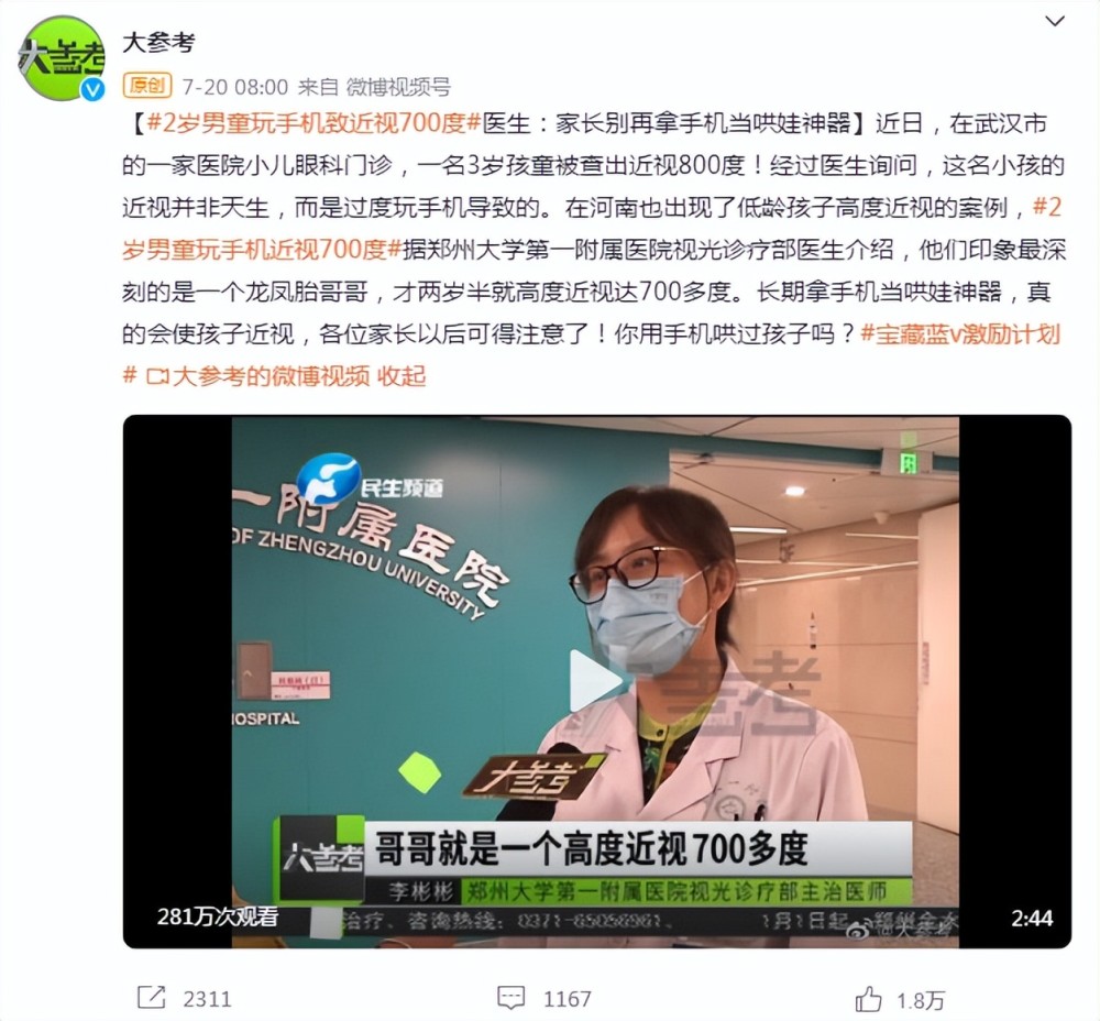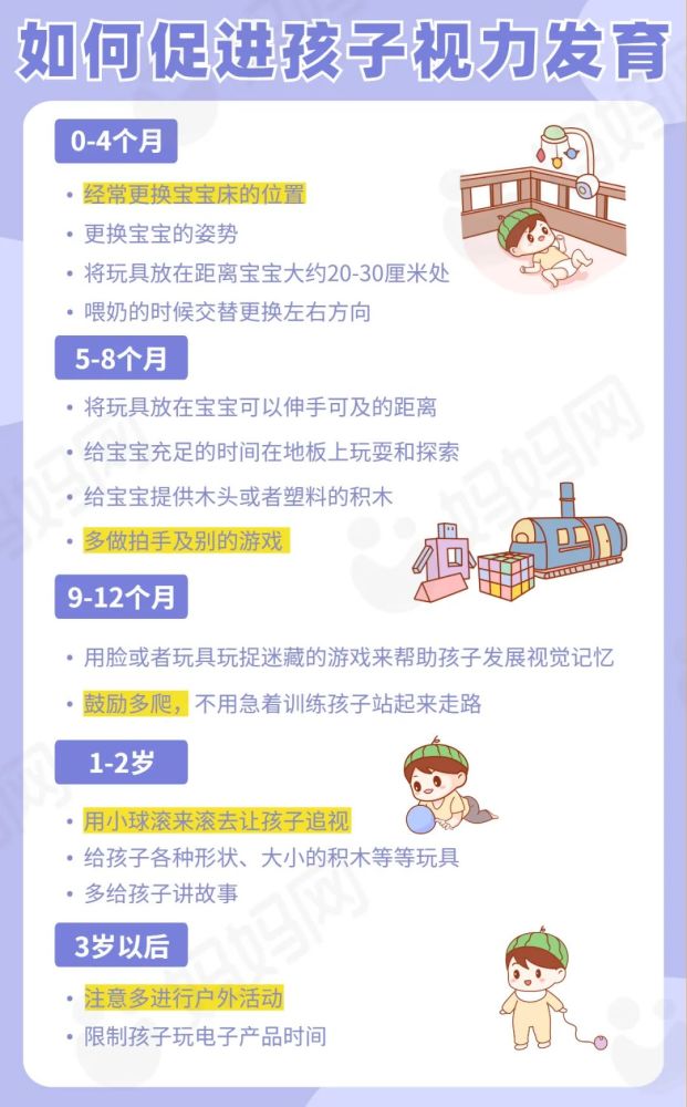 都说眼睛是心灵的窗户,好的视力能让孩子更好地领略世间万物,充盈内心。 然而,理想是丰满的,现实却是骨感的。 等到孩子进行视力检查时,很多家长却发现孩子视力竟然存在各种问题,心情顿时如遭雷劈。 福州4岁女孩因为爱玩平板电脑,用眼过度,导致近视1300度 河南一名2岁孩童被查出近视800度宝宝从出生到3岁这段时间,是视力发育的“黄金期”,咱们做父母的千万不要觉得视力是等孩子上学后才需要担心的事情。 保护视力得从小抓起!今天,局长就给大家好好盘一盘近视、远视、弱视、散光这四大儿童视力问题,希望家长们都能认真仔细地看看。 1 四种儿童常见的视力问题 以及护眼方法 1、近视 先来说说家长们最焦虑的视力问题——近视。 据报告统计,2020年我国儿童青少年总体近视率为52.7%,其中6岁儿童为14.3%,小学生为35.6%,初中生为71.1%,高中生为80.5%。 近10%的近视学生为高度近视,并且占比随着年级升高而增长。 孩子会近视,主要有两方面因素: 第一个是先天因素。如果爸妈都是高度近视(>600度),那么很不幸,孩子基本上就是近视的“天选之人”。 第二个则是后天因素,也就是和孩子的用眼行为、用眼习惯、用眼环境相关。 “看太久、距离近、光线暗”,都会导致近视。 看太久、距离近: 如果孩子经常长时间近距离用眼,比如刷手机、打电子游戏、看电视等等,就会把宝宝天生的远视储备提前消耗掉。 儿童的“远视储备”,就像一张银行卡,宝宝在出生时在卡内存了一定的金额,随着用眼消耗,金额逐渐减少,直到花光成负数,就会出现近视。 应该怎么做: 01 距离要合适 保持眼睛与书本的距离,最好大于33cm;绘本优选字大一些的,避免孩子为了看清而距离过近;手机离眼睛的距离,至少要相当于眼睛到肚脐眼的距离;电视离眼睛的距离,是电视屏幕对角线的3-5倍。 图源:网络02 时长得控制 儿童单次使用电子产品的时间建议控制在15-20分钟比较合适,推荐“20-20-20” 护眼法则,即在看电子屏幕后,每隔20分钟要休息一下,看6米以外的物体,每次看至少20秒。 关于不同年龄孩子使用电子产品的时长,美国儿科学会也给出了建议: 18个月以下的孩子,除了与亲人视频聊天以外,避免电子产品的使用; 18-24个月的孩子,如果想引入电子产品,选择高质量的节目,并且确保和孩子一起观看; 2-5岁的孩子,每天观看电子产品节目的时间不要超过1个小时。 另外,局长需要提醒家长的是,在孩子长时间学习完之后,不建议再去弹钢琴,玩国际象棋、围棋,拼搭乐高等近距离用眼活动,否则孩子眼睛根本没有得到休息。 光线明暗度 除了用眼不当,这个被很多人忽略的关键的一点:光,也会对孩子近视产生影响。 日常生活中的自然光,灯光、电脑手机屏幕等电子器械发出的光,太亮太暗,又或者忽明忽暗,都会让孩子眼睛不舒服,甚至出现视力下降。 特别是儿童,晶状体结构比成人更透明,光线更易穿透直达眼底,因此也更容易被光线影响。 应该怎么做: 室内光线避免过暗或过亮,以免造成孩子的视觉疲劳。比如,看电视时不要因为追求视觉效果而把灯都关掉,孩子在黑暗环境下长时间注视电子屏,会对眼睛产生损害。 阅读的光线照度至少要有500lux,可以考虑买个测光仪测试一下家里的亮度够不够,给孩子选购合适的读写灯。 图源:编辑部聊天实况儿童台灯的选购避雷和推荐科普,可以点击以下文字链接跳转查看(推荐款涵盖各价位,不是广告,良心安利): 家长都被骗了!不合格率超83%:家里这些伤眼的儿童台灯,还不赶紧扔! 说到光线的问题,不少家长会问,宝宝晚上睡觉开一盏小夜灯,对宝宝的视力有危害吗? 其实,家长无需太担心。 开灯睡觉对视网膜造成损害的前提是:高亮度+长时间照射,而且光线需要是蓝光。 目前市面上的小夜灯,大多都达不到这个级别。只要注意购买灯光柔和的产品,使用时尽量避免灯光直射孩子的眼睛,小夜灯还是可以继续使用的。 除了以上提到的三点,户外活动的时间也会对儿童近视产生影响。 越来越多研究证据表明,增加户外活动时间能防止近视的发生,或能延缓近视加深。 室内和夜间运动无效,必须要在白天接受外界自然光线的照射才有效果。 根据世卫组织建议,儿童每天都需要充分的体育活动,时长因年龄而异。例如: 1至2岁儿童每天进行的各类体能活动应不少于180分钟。3至4岁儿童的活动时长标准与此相同,只不过中等至高等强度身体活动应占其中60分钟。5至17岁的儿童与青少年每天应进行至少60分钟的中等至高等强度身体活动。 2、远视 其实所有婴幼儿都是“远视眼”,大部分新生儿都有200-300度左右的远视。 对于婴幼儿来说,低于300度的远视都是正常的,随着宝宝长大,远视的度数也会逐渐下降。 上文提到的“远视储备”,说的就是儿童时期拥有远视度数足够,将来近视的风险就会越低。 儿童在学龄期到成年期之间会大量近距离用眼,慢慢消耗视力,让远视变成正视,让正视变成远视。 所以说,如果在儿童期检查出远视的情况,只要度数不要过高(超过300度),家长就没有担心的必要。 图源:网络3、散光 散光是天生的,它甚至不能被称为一种疾病,仅仅只是我们眼睛屈光不够完美的表现而已。 简单地说,就是我们的眼球不够圆,导致不同方向进入眼球的光折射不一致。 下面这张图,可以帮助大家自测散光: 摘掉眼镜(无论是框架眼镜还是隐形眼镜);将手机与眼睛拿到同高的