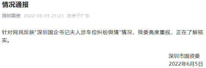 图源:椒点视频截图 深圳一位“夫人”霸屏了! 6月4日,深圳市福田区宝能公馆小区停车场发生的一幕周日晚上窜上热搜第一。 那么,到底发生了什么呢?据网络平台传播的视频显示,在该小区地下停车场内,一长发女子与周边不少人发生争吵。这名女子称,“我的车位有买卖合同,这个车位谁敢说是他的? ”如果车主现在不挪车,她就会开车来堵住车辆。最为关键的是,她还放话:“我家加起来有50台宾利,都不用,开过来堵。” 该女子到底是谁?为何为了一个车位如此发飙?真相到底是啥?5日,当地居委会工作人员表示,被占车位确为这位女业主所买。女业主已报警,社区等相关部门到场协调。 5日晚上,深圳国资委在其官微发布消息称,针对网民反映“深圳国企书记夫人涉车位纠纷舆情”情况,我委高度重视,正在了解核实。 深圳女子突然刷屏 周日晚间,吃瓜群众突然兴奋起来。在社交平台上,深圳一位女子突然火了。因为,她扬言要叫50台宾利去堵车位。 事情大概是这样的:6月4日,在深圳市福田区宝能公馆小区停车场,两位业主因停车位起纠纷,女业主称车位被占一个月不挪走。对方坚称是公共车位拒不挪车,双方发生激烈争吵。女子要求占车位的业主将车开走,否则开宾利过来堵车。 网络间流传的视频显示,该女子称,“我的车位有买卖合同,这个车位谁敢说是他的?”如果车主现在不挪车,她就会开车来堵住车辆。 随后,该女子让其随行人员去将自己的宾利开过来,称一个月不用,就堵在这里。该女子放话: “我家加起来有50台宾利,都不用,开过来堵。” 先抛开50台宾利一事不论,该女子维权的真相究竟是啥?据媒体报道,6月4日,小区居民因为争夺车位发生了冲突。“相关车位的归属权、使用权,是否应该属于该女子,很多业主有异议。”该人士称,当天的冲突从下午一直持续到晚上,多个车位上的地锁被撬,民警、街道办工作人员都到了现场进行调解。 小区物业工作人员曾回复媒体称,开发商卖房的时候与白衣女子签过合同,并确认该女子有相关车位的使用权。6月5日,居委会工作人员表示,被占车位确为这位女业主所买。但同时,当地街道办值班人员回应媒体时表示,街道办已就此事组织召开过多次会议,有无结果还不知情。目前,当地公安机关也已经介入协调。 另有坊间传闻指,宝能公馆分为住宅楼和商务楼,商务楼的业主购买房产时,宝能公司附赠了一个停车位,停车位就位于住宅楼楼下停车场。住宅楼的业主认为宝能公司没有公示就私自售卖,主张维权。部分住宅楼的业主将车辆停到了这些争议车位,并引发了上述之冲突。 车位归属权究竟如何?事件会有何处理?还需进一步的调查结果公布。 50台宾利 不过,从目前的舆情来看,大家关注的焦点似乎并不在维权上,而在50台宾利和这位女子的身份上。 当晚,关于这位女子的身份,网上亦有一则传闻指,她是深圳某国企纪委书记的夫人。并且,网上还有一则该公司对此事的情况说明:XX公司纪委高度重视,迅速组织工作组查清相关事实,现通报如下: 张某忠同志名下没有车辆,网传车辆为张某忠同志爱人从朋友处借得临时使用。张某忠同志平时工作较忙,忽视了家风建设,致使其配偶情绪激动之下发表不当言论,造成不良影响。公司党委已责令其本人作出深刻检讨。感谢广大网友对我司工作的支持和监督,下一步,我司将以此为契机,加大对党员领导干部的家庭家教家风建设。 事后,深圳国资委也在其官微上做了回应:针对网民反映“深圳国企书记夫人涉车位纠纷舆情”情况,我委高度重视,正在了解核实。 其实,这个事情还真要分开来看。 首先,维权并没有错,若真如上述居委会所说,车位真是归这位“夫人”所有,那她就有维权的正当性。不少网友也表示,能够感同身受。晚上回家发现车位被占,然后对方还故意把挪车电话关上,真的是气死人!至于其维权的方式,人在气头之上,难免会有过激行为,说一些过激的话,这也并非不可以理解。 其次,舆论之所以会关注到“50台宾利”,还是因为她的身份问题。一位国企“纪委书记”的夫人拥有50台宾利,很容易让人联想到这些车、甚至她家财产的“合规性”。这也是长时间以来,网络间形成的对富人阶层形成的一种看法。事实上,这个问题并不难解决,是她自己拥有50台宾利,还是她的家族拥有?是她可以从朋友处借来这么多车,还是她经营着宾利的4S店?只需上级部门调查一下,就会很清楚。另外,若她真正拥有50台宾利,只要是合法所得,理应受到法律的保护。反之,也必将受到法律的严惩。