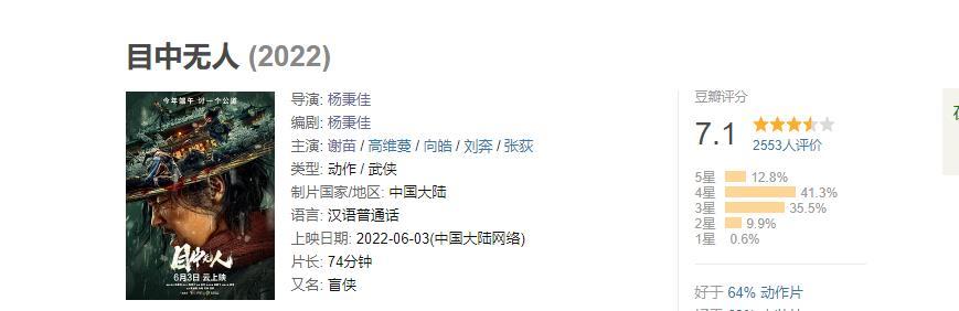提起谢苗,很多观众第一时间想到的就是惋惜 曾经最红的武打童星,合作的都是李连杰,梅艳芳,周润发等等超级巨星,却在最火的时候选择了读书,再回到娱乐圈却已经是物是人非,李连杰已经有了“干儿子”文章,自己也是半隐退状态,基本上帮不上谢苗 在经过几部电视剧和院线电影的失利之后,谢苗早早地转型拍网络电影了 但对于关注动作片的影迷来说,提起谢苗,第一时间想到的就是坚持! 最难的时候都没有放弃动作片,谢苗真是童星中的清流 华语童星有很多,大部分长大之后都泯然众人矣,留在娱乐圈的也很少能发展起来,杨紫走了偶像流量路线,张一山不温不火,一部《鹿鼎记》消耗完了观众缘 更多的是像嘎子谢孟伟这样利用情怀当了网红,忘记了做演员的初心 但你肯定很少听到谢苗的八卦消息,好像除了拍戏,谢苗就不是娱乐圈的人 当然一个最重要的原因是谢苗真的很忙,一开始转型拍网络电影,谢苗便是工作狂人,经常是一年要上线五六部电影,甚至是七八部。网络电影是拍得快,但这种产量,谢苗真的是要住在剧组 有一说一那时候的谢苗已经“过气”,拍的网络电影基本上都是烂片 但凭借一身好功夫,谢苗近年来在网络电影中的票房号召力是最高!就拿今年上线的《烽火地雷战》《齐天大圣》两部网络电影来说,分账票房都在千万上下,在网络电影中千万分账票房就是爆款的证明 而谢苗可以轻松拿到手 度过了最难的时候,有了知名度和号召力,我们可以看到近年来谢苗终于可以拍自己想要的动作片了 这两年的《大汉十三将之血战疏勒城》《辛弃疾1162》《东北警察故事》《血战虎门》都有和院线动作片掰手腕的实力,而最新上线的《目中无人》,已经到了让大部分院线武侠片“脸红”的地步 观众好评度破89%!《目中无人》连夺3天冠军,片长74分钟不够看 6月5号谢苗主演的最新武侠片《目中无人》豆瓣开分!作为一部网络电影,《目中无人》竟然有7分,更让人惊讶的是6月6号《目中无人》还上涨到了7.1分 根据观众打分来看,89%的观众打出了三星以上的好评,只有不到11%的观众打出了两星以下的差评 这不仅仅是2022年网络电影最佳口碑,甚至是网络电影影史最佳口碑之一 凭啥? 《目中无人》最大的遗憾就是只有74分钟,让不少观众感慨不够看 电影的剧情非常简单,谢苗饰演的成瞎子是一个捉刀人 何谓捉刀人?就是帮助官府捕猎通缉犯为生的赏金猎人,多年前的故事,让成瞎子眼睛是瞎的,心是凉的!一个身怀绝技的高手,遇到了天真无邪的酒家女倪燕 成瞎子遇到倪燕时是大喜的日子 倪燕正要结婚,热情地邀请路过的成瞎子喝一杯喜酒 洒脱的成瞎子自然不会客气,开怀畅饮,昏昏睡去 一觉醒来,大喜变成了大悲 成瞎子嗅到了空气中的血腥味,善良可爱的倪燕全家都没了,自己也被侮辱了 心已经凉了的成瞎子不想管 但《目中无人》诠释了中国武侠片的浪漫,滴水之恩,涌泉相报,喝了人家的酒,就该给人家求一个公道 电影的剧情极为简单,但节奏紧凑,没有一点拖泥带水 电影最出彩的无疑是动作场面 尤其是最后的火焰刀大战,成瞎子一把火焰刀在雪中大战数十人!雪与火,快于慢!成瞎子刀刀致命,拳拳到肉,比起那些偶像流量明星摆pose的花架子功夫不知道高的哪里去 观众也没有辜负谢苗的努力 《目中无人》上线以来连夺3天热度冠军,要知道《目中无人》可是一部付费电影,以目前的热度《目中无人》票房恐怕比端午档院线大片都高! 《东北警察故事2》杀青,谢苗又带来一部生猛新片 《目中无人》刚刚拿下了好成绩,原班人马打造的《东北警察故事2》又杀青了,根据网络电影的制作速度,相信很快就会和观众见面 《东北警察故事》是谢苗网络动作片的代表作之一 2021年国庆档上线,分账票房破1306万的大爆款,一度在豆瓣上拿下了6.8分的口碑 电影虽然剧情有点逻辑不通,但打戏极为精彩,尤其是谢苗和反派公交车大战,看得观众热血沸腾 这次《东北警察故事2》相信也是一部生猛动作新片,以目前的电影质量,38岁的谢苗真的是未来可期,动作演员大器晚成很正常,华语动作片也算是后继有人了。