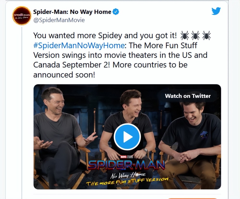 蜘蛛侠将再度回归院线! 为了庆祝《蜘蛛侠》漫画诞生 60 周年,索尼影业宣布推出《蜘蛛侠:英雄无归》加长版,该版本赋予了新的标题「更有趣的版本(More Fun Stuff Version)」重返影院。新版电影将于9月2日在美国和加拿大等地区的影院上映。 在《蜘蛛侠:英雄无归》官方帐户的推文中,《蜘蛛侠:英雄无归》的三代小虫主演 -- 汤姆·霍兰德,托比·马奎尔和安德鲁·加菲尔德,在开玩笑的谈笑视频中宣布了新的剪辑版本。剪辑以三个蜘蛛侠互相指向对方致敬了漫画经典的场面而结束。 《蜘蛛侠:英雄无归》是汤姆·霍兰德主演的 MCU 系列电影第三部,继《蜘蛛侠:英雄归来》和《蜘蛛侠:英雄远征》后,霍兰德再次扮演彼得·帕克,这次他将面对来自多元宇宙的各种反派。 《蜘蛛侠:英雄无归》由哥伦比亚影业公司、漫威影业联合出品,乔·沃茨执导,汤姆·赫兰德、赞达亚·科尔曼、本尼迪克特·康伯巴奇领衔主演,雅各·巴塔伦、玛丽莎·托梅、托比·马奎尔、安德鲁·加菲尔德、威廉·达福、阿尔弗雷德·莫里纳、杰米·福克斯等主演的动作科幻电影,该片于2021年12月17日在北美上映,于2022年3月22日数字上线,并定于4月12日发行4K、蓝光、DVD。” 《蜘蛛侠:英雄无归》是英雄系列三部曲的完结篇,也标志着漫威多元宇宙的正式开启。此次,蜘蛛侠(汤姆·赫兰德 饰)与奇异博士(本尼迪克特·康伯巴奇 饰)继《复联4》后再度联手打响时空混战。蜘蛛侠借助奇异博士操控时空的能力打开了时空通道,引发了前所未见的危机。 幸运的是,他得到了来自其他宇宙蜘蛛侠的帮助,包括山姆·雷米版本中的托比虫,以及《超凡蜘蛛侠》系列中的加菲虫。 2 ~+ D) L2 e# S7 i6 I3 J