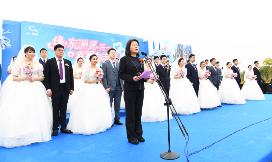 11月10日上午,“缘•东洲愿 幸福向未来”首届青年人才集体婚礼在謇公湖生态公园举行,百位新人在众人的见证和祝福下完成了甜蜜的人生大事。区委书记郭晓敏现场为新人证婚并送上祝福。区委副书记徐加明出席活动。本次活动由区委、区政府主办,区委组织部、区总工会等部门承办,现场共有50对新人参加集体婚礼。新人中既有来自机关事业单位的工作人员,也有来自企业一线的职工代表,其中有约三分之二是离开家乡、扎根海门经济社会建设的新海门人。 郭晓敏向喜结良缘的新人以及新人家属表示热烈的祝贺和真心的祝福。她说,首届青年人才集体婚礼代表了区委、区政府浓厚的爱才之心、引才之情和留才之意。作为服务青年人才的重要举措,海门将持续发挥“党建带群建、群团共建”的机制优势,为广大青年朋友们牵线搭桥当“红娘”,帮助大家寻觅知音、邂逅爱情,让海门真正成为青年朋友们生命的根基、生长的土壤、缘分的起点。 郭晓敏希望新人们继承和发扬中华民族的传统美德,共同担负起对家庭和社会的责任,以家庭和睦促进社会和谐;饱含登高之志,不负时代、勇担重任、踏实勤奋,练就过硬本领,在波澜壮阔的人生道路上展示才华、彰显作为。希望广大青年以新人们为榜样,自觉践行社会主义核心价值观,涵养和谐民风、培育文明乡风、倡树社会清风,争做社会风尚的引领者、推动者、实践者,推动全区精神文明建设不断迈上更高水平,为谱写“强富美高”新海门现代化建设新篇章贡献精神和力量。