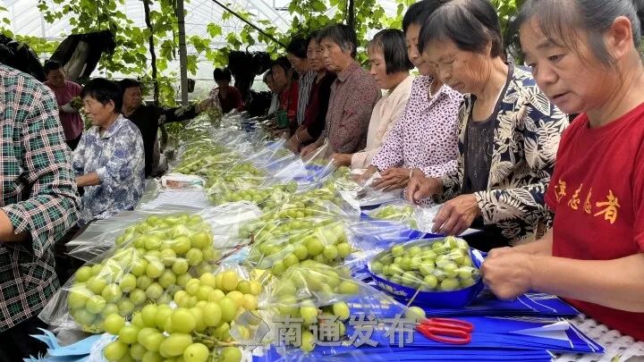 9月16日下午,海安九久乐家庭农场外,几辆冷藏车正焦急地等待葡萄装车,而棚内43位村民正熟练地包装串串晶莹剔透的“阳光玫瑰”,一片繁忙的景象。海安九久乐家庭农场的“阳光玫瑰”和火龙果深受外地水果商的喜爱,也成为海安李堡镇蒋庄村的一大特色产业。