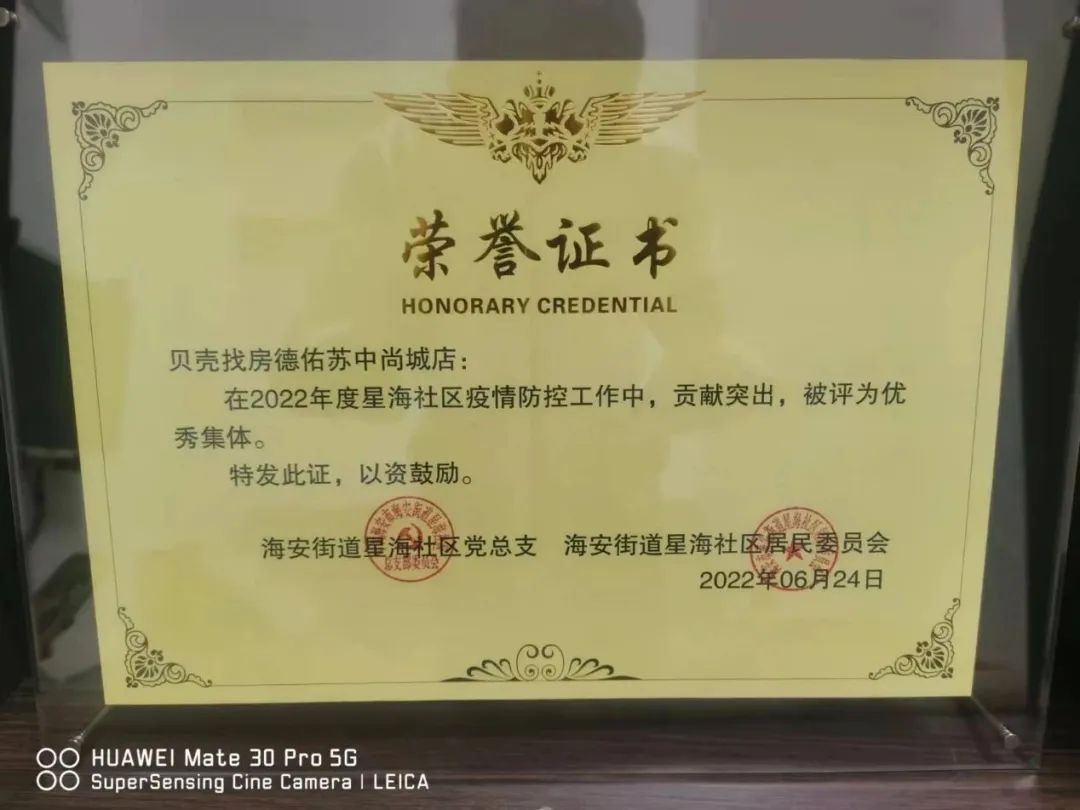 贝壳合作新经纪品牌德佑店东袁鉴军带领全店经纪人全身心投入社区防疫,在海安星海社区的防疫工作中贡献突出,先后获得“优秀集体”和“防疫先锋”的称号。