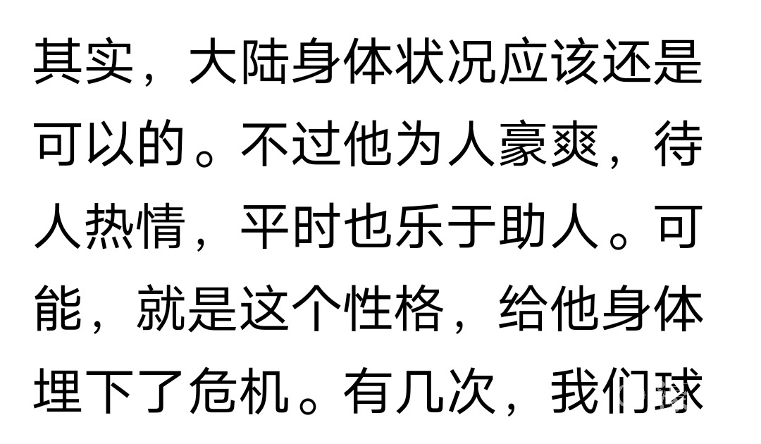 其实,大陆身体状况应该还是可以的。不过他为人豪爽,待人热情,平时也乐于助人。可能,就是这个性格,给他身体埋下了危机。有几次,球友们在一起聚餐,他的酒量,让大家着实领教了一番。他不仅能喝酒,喝酒速度也快,酒量大约是我的四倍。当然,我的酒量属于初级阶段,从80年代在东北学会喝酒,至今没有长进。