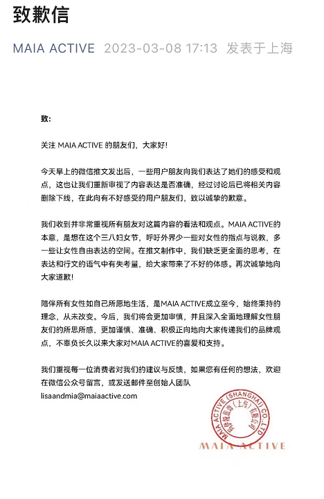 下午5时,MAIA ACTIVE在微信公众号发布致歉信,称“向有不好感受的用户朋友们,致以诚挚的歉意。”该品牌还解释,本意是想在三八妇女节呼吁外界少一些对女性的指点与说教,多一些让女性自由表达的空间。但在推文制作中,缺乏更全面的思考,在表达和行文的语气中有失考量。信的结尾附上了创始人邮箱,以接收消费者意见与反馈。