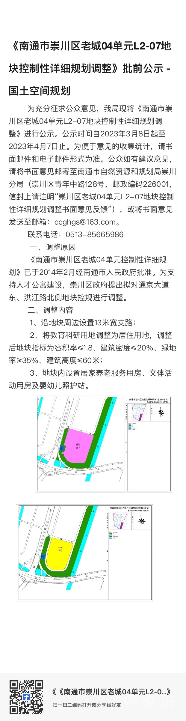 [新闻快讯] 《南通市崇川区老城04单元L2-07地块控制性详细规划调整》批前公示 |
