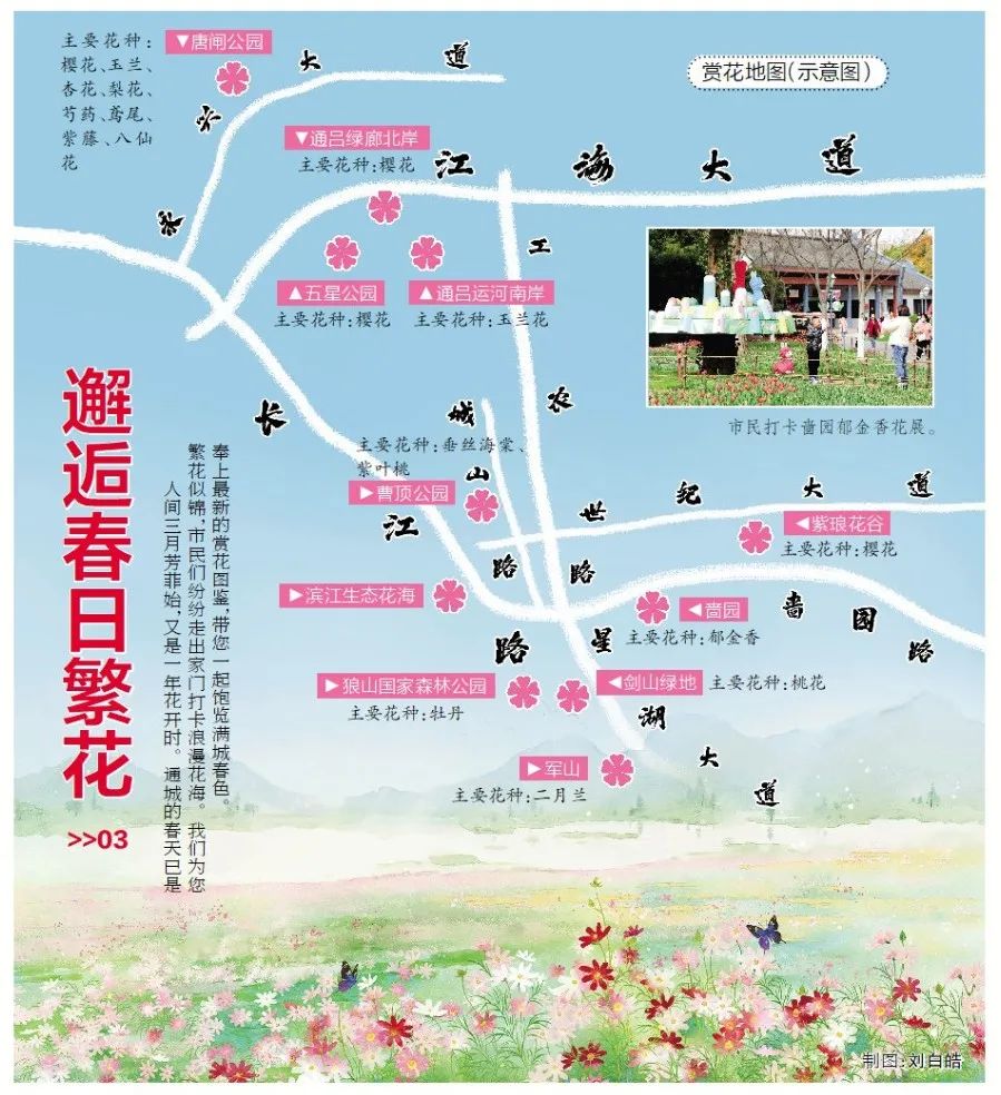 记者从市市政和园林局绿化管理处了解到 唐闸公园园林路、 通吕绿廊北岸、五星公园等地 也都能欣赏樱花
