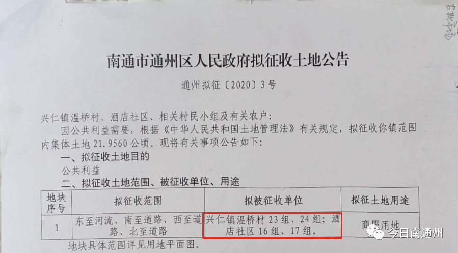 3月20日,南通市通州自然资源和规划局发布了《南通市通州区人民政府拟征收土地公告通州拟征〔2020〕3号》征地告知书,拟征收兴仁镇温桥村23组、24组和酒店社区16组、17组的土地,面积为21.9560公顷,用途为商服用地,并发布了地块的用地平面图。