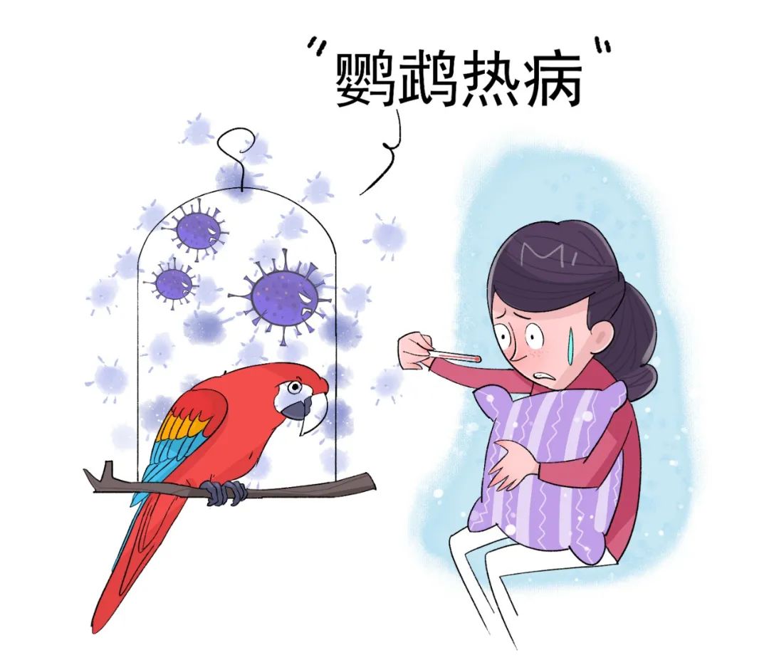 鹦鹉热又称鸟热、鸟疫,最初发现跟饲养鹦鹉有关,故名“鹦鹉热”。 主要由鹦鹉热衣原体感染所引起,会在鸟、禽类之间传播和感染,体质稍差的市民接触带菌动物后,也会被感染。其传染源包括带菌或发病的鸟类或家禽、含菌的分泌物或排泄物所污染的环境、羽毛及尘埃,饲养的外观健康但却排菌的鹦鹉、金丝雀等鸟类等。海鸥、鸽子、金丝雀、相思鸟、红雀、苍鹭、鸡、鸭等190余种鸟类和家禽可传播此病。 该病经呼吸道传播,吸入含有鹦鹉热衣原体的尘埃或气溶胶而引发感染;也可经皮肤、黏膜或消化道传播:接触带菌的分泌物、排泄物引起感染;人与人之间传播虽有报道,但较为罕见。