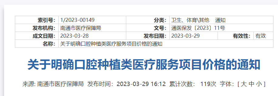 根据《江苏省医疗保障局 江苏省卫生健康委员会关于公布口腔种植类医疗服务价格有关事项的通知》(苏医保发〔2023〕15号,附件1),现就明确我市口腔种植类医疗服务项目价格通知如下: