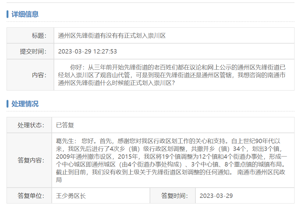 [新闻快讯] 通州区先锋街道要划入崇川区?官方回应了! |