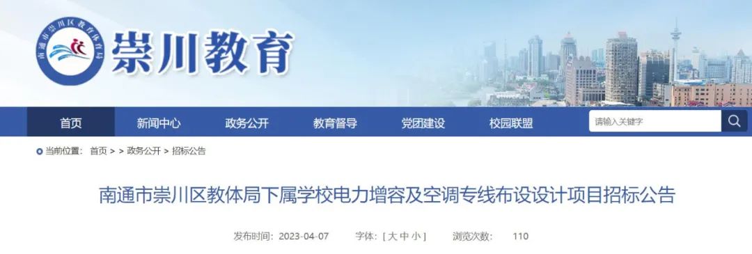 招标公告显示,崇川区教体局下属学校电力增容及空调专线布设设计项目已批准建设,招标人为南通市崇川区教育体育局,项目已具备招标条件,现公开招标。